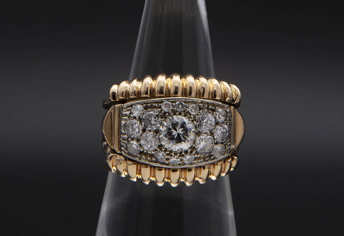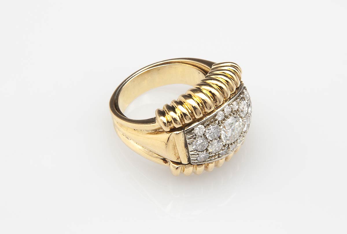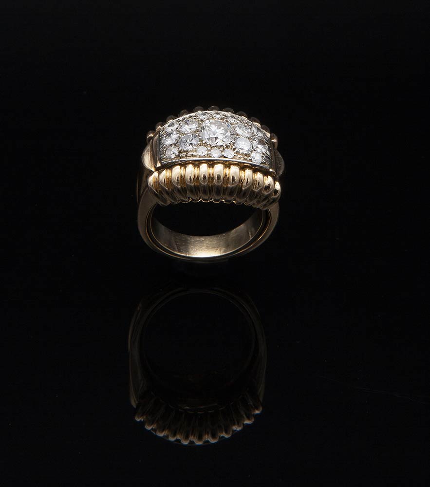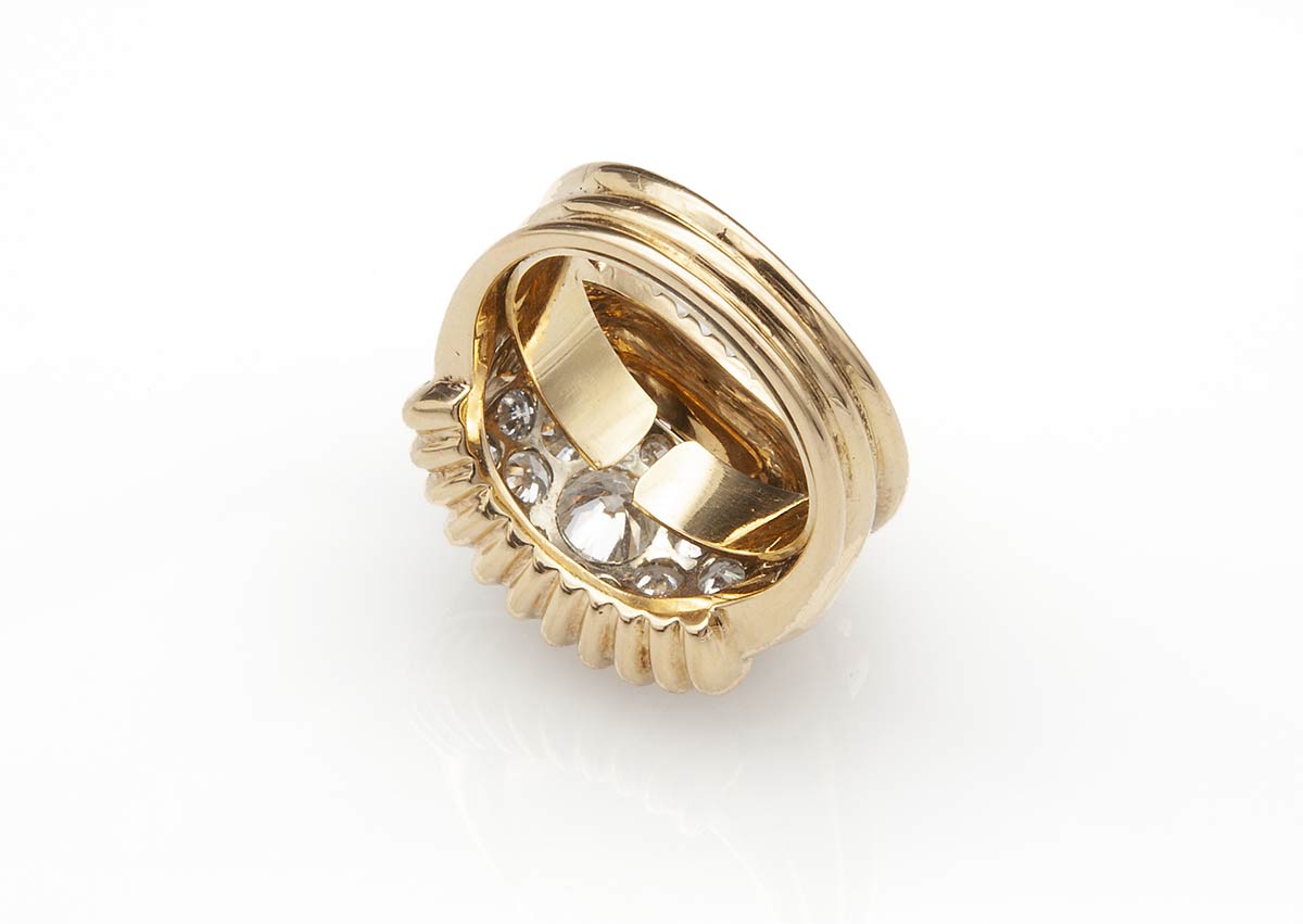 in oro rosa e bianco 18k, modellato come una fascia, incastonato con diamanti taglio brillante 2,10 ct ca., H-J, VS-SI. Dimensioni fronte 22 x 17 mm. Misura IT 13,5 - US 7 (con regolatore). Peso 19,4 gr. Stato di conservazione: ***** ottimo.