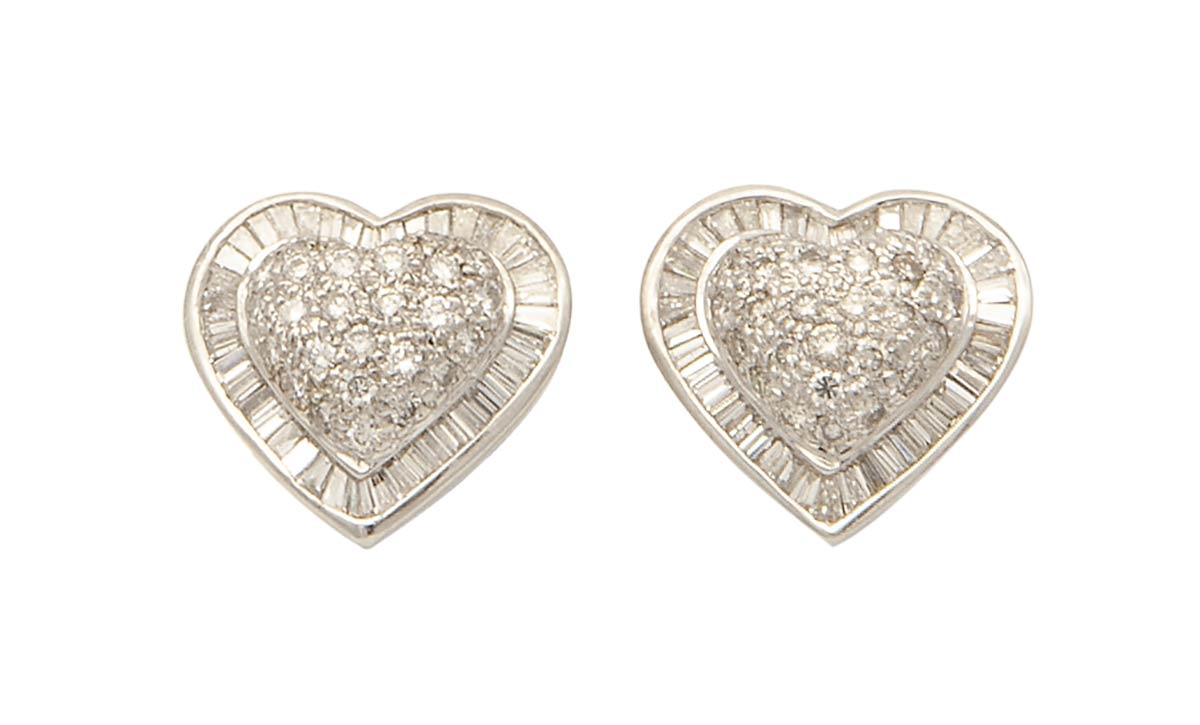 in oro bianco 18k, a forma di cuore con diamanti taglio tapered 2,40 ct ca. e diamanti taglio brillante 1,20 ct ca., F-G, VVS. Weight 5 gr. Punzonato "750" e "18 kt". Dimensioni 14 x 13 mm. Stato di conservazione: ***** ottimo.