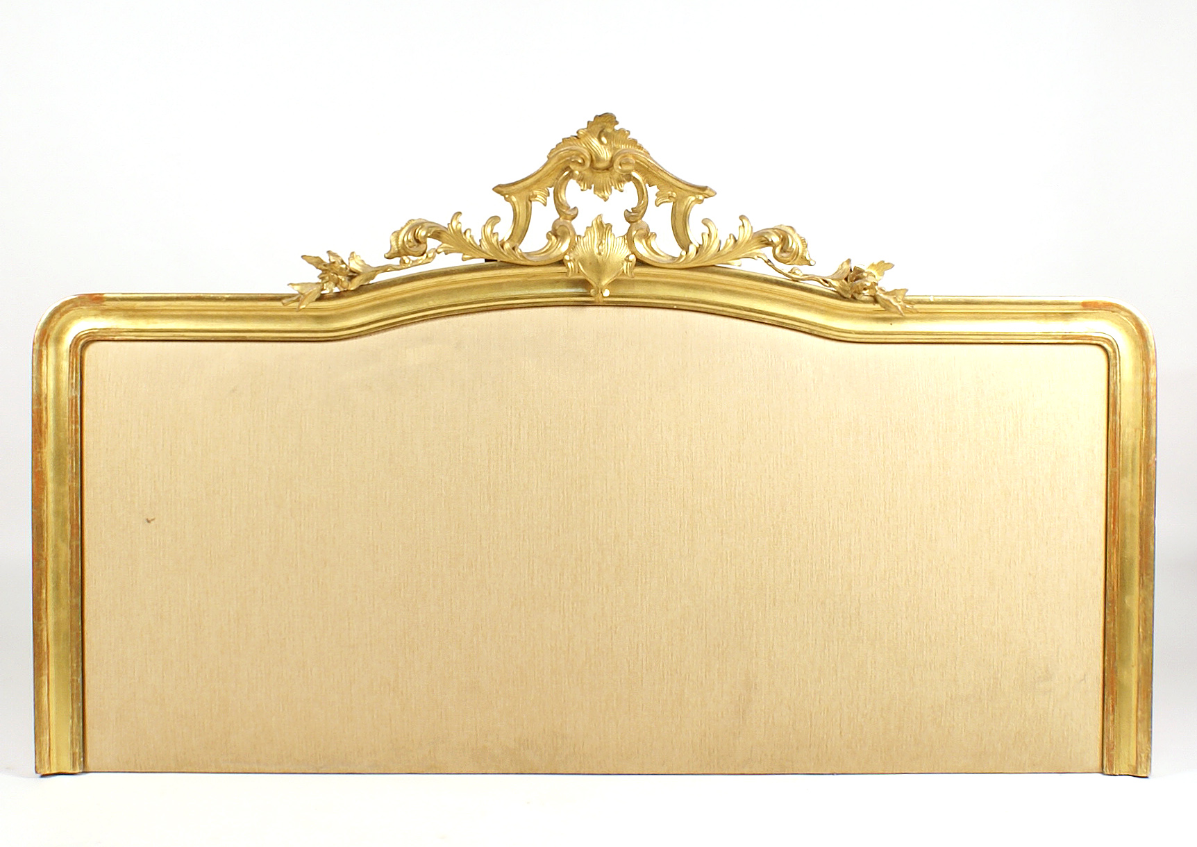 TESTATA DA LETTO DI LINEA MOSSA in legno dorato centrato da fregio intagliato a motivo floreale e di volute, parzialmente imbottita in tessuto 104x116 cm.