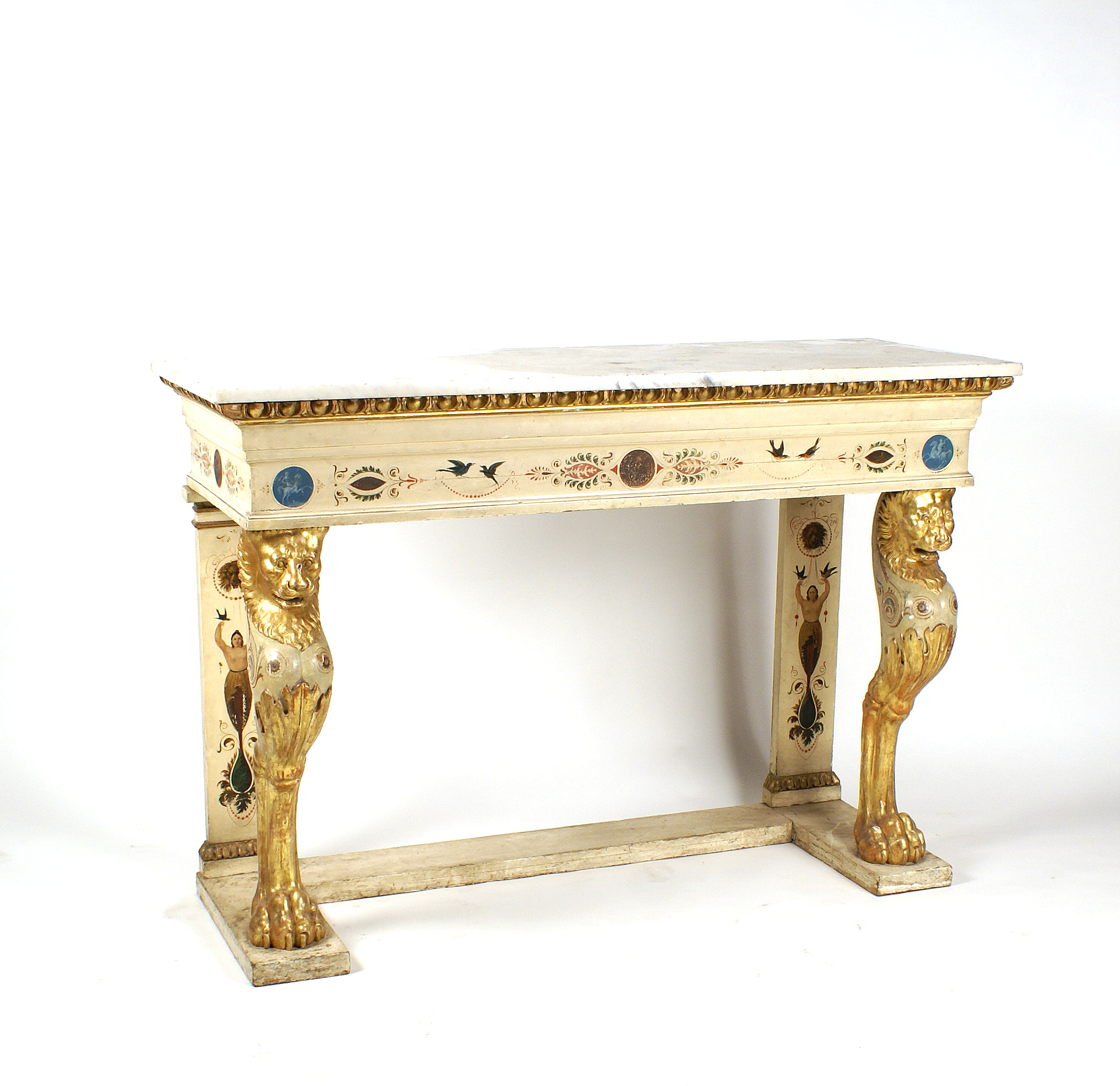 CONSOLE NEO CLASSICA Toscana XIX Sec. in legno laccato e parzialmente dorato dipinto in policromia, piano rettangolare in marmo, sostegni anteriori a motivi ferini 94x136x51 cm.