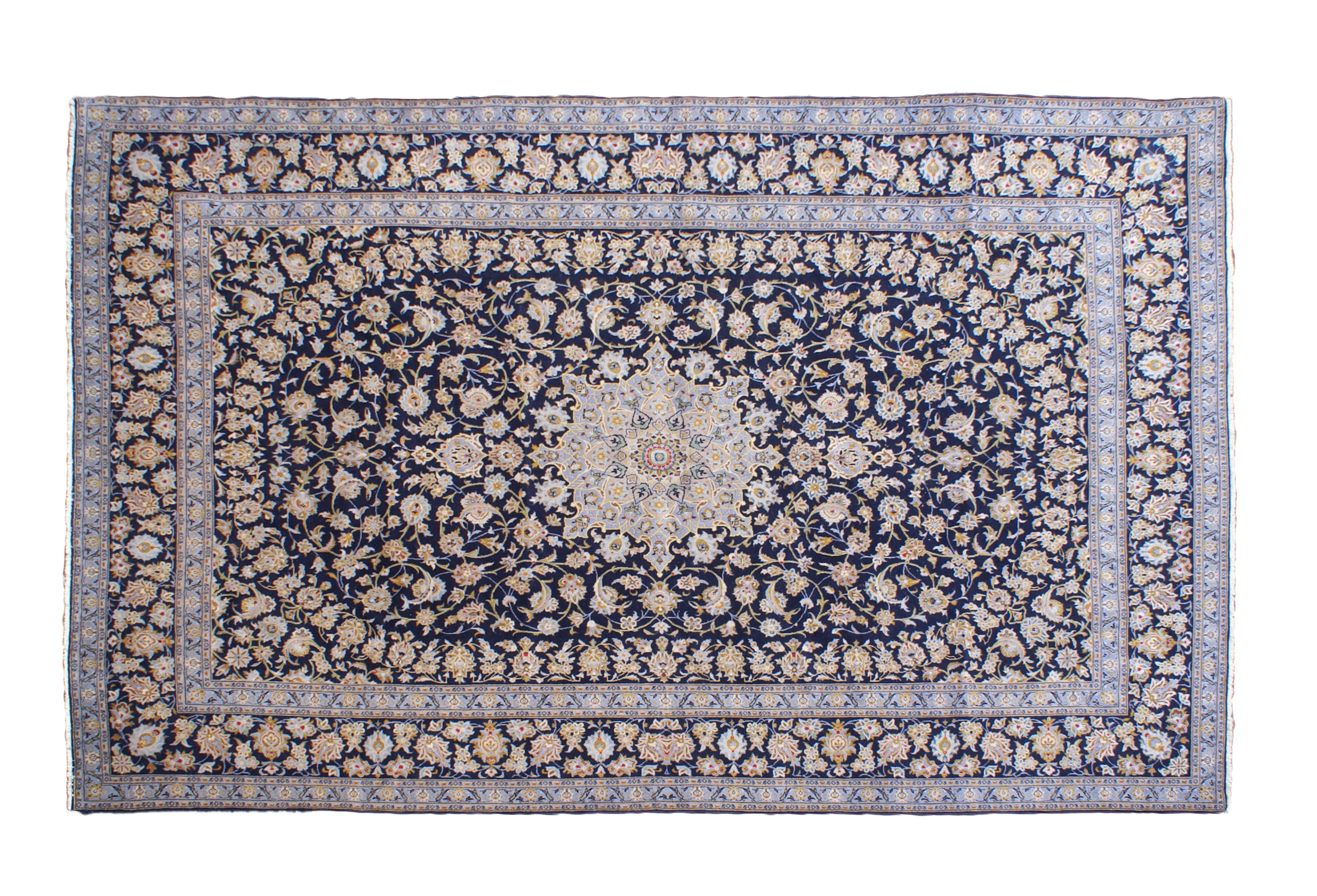 TAPPETO KASHAN lana su trama in cotone, disegno floreale su fondo blu 491x318 cm.