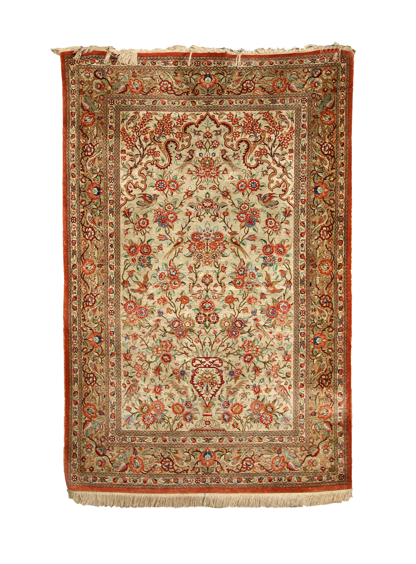 TAPPETO KUM Persia in seta su trama in seta, fondo verde chiaro 157x101 cm.