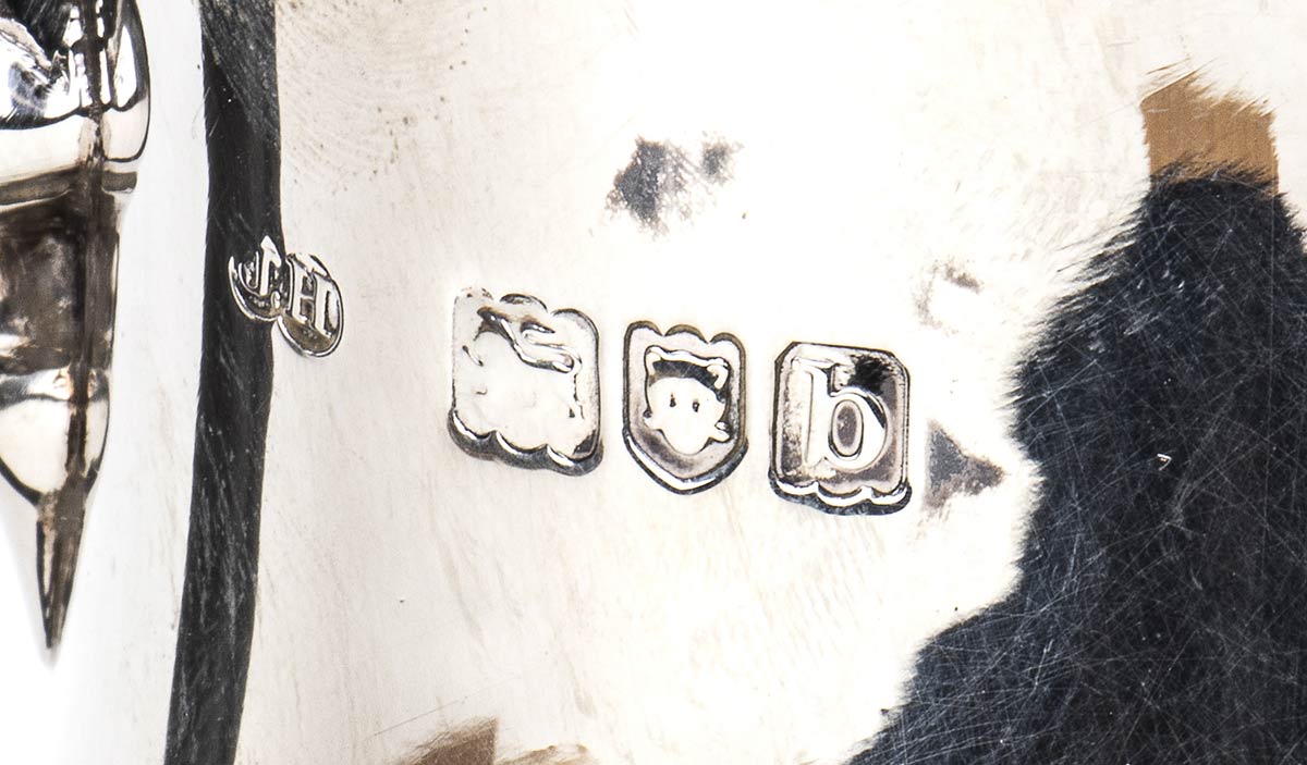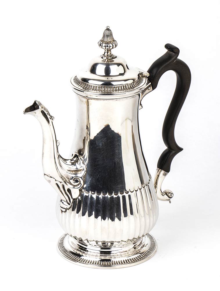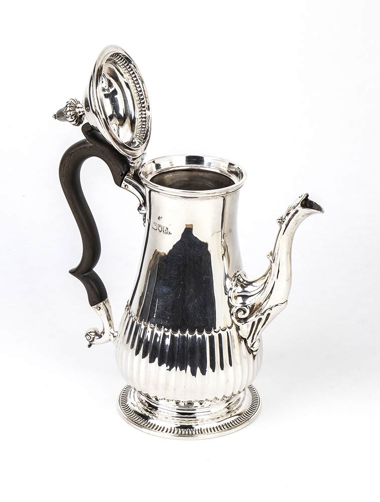 corpo godronato nella parte inferiore poggiante su piede circolare, manico a doppia voluta in legno ebanizzato. Serie completa di marchi Londra 1896-1897, argentiere Sibray, Hall & Co Ltd. Altezza 22 cm, diametro base 9,5 cm. Peso 520 gr. Stato di conservazione: **** buono.