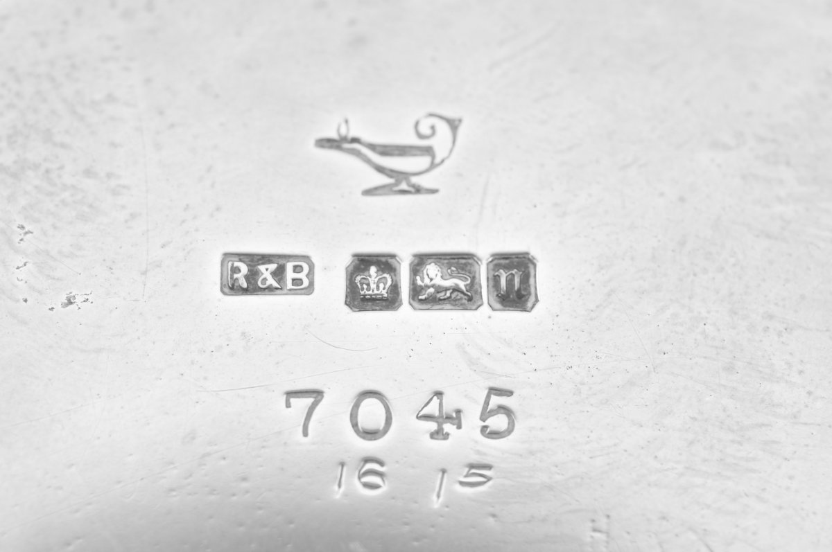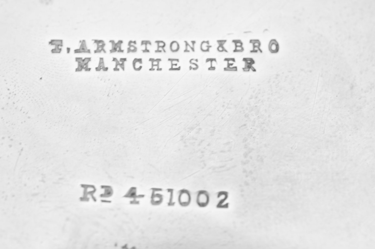 di forma sagomata, decorato con volute fogliate perimetrali. Serie completa di marchi Sheffield 1905-1906, argentieri Robert & Belk. Diametro 25,5 cm. Peso 470 gr. Stato di conservazione: **** buono. (Jackson’s p. 432; Culme V1 p. 389 - V2 p. 247)
