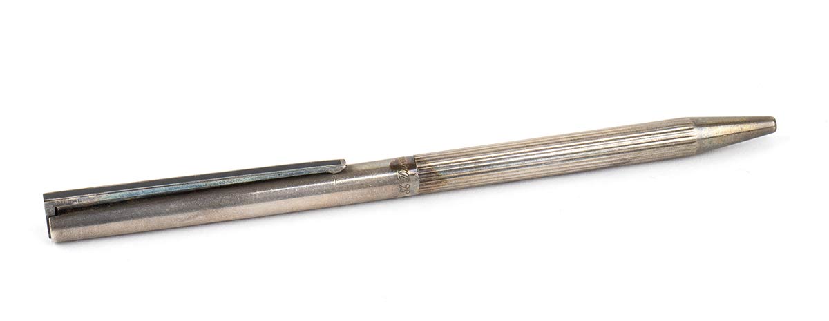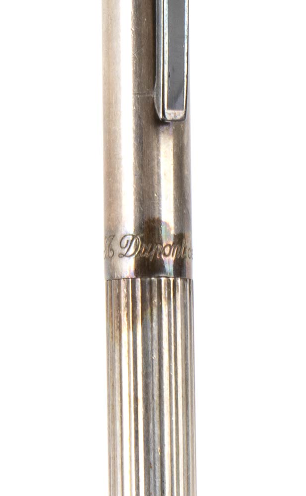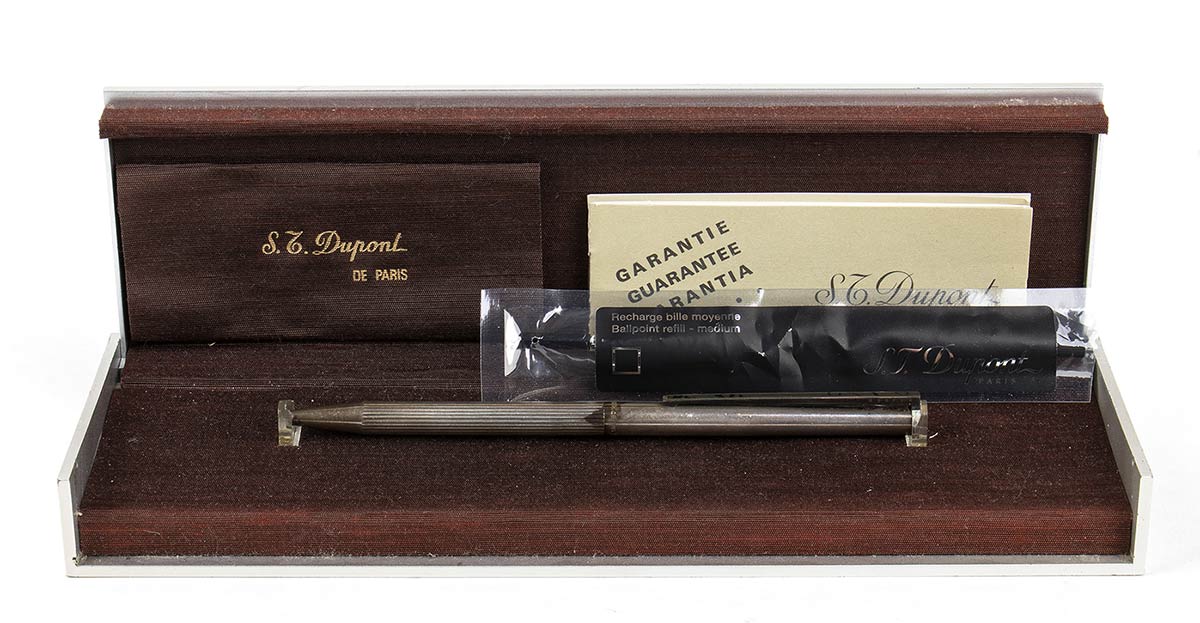 corpo e cappuccio in argento 925/1000, clip con smalto nero. Cappuccio firmato "S T Dupont de Paris 925". Lunghezza 13,5 cm. Stato di conservazione: **** buono. Con refill nuovo originale. Scatola e documenti originali S. T. Dupont.