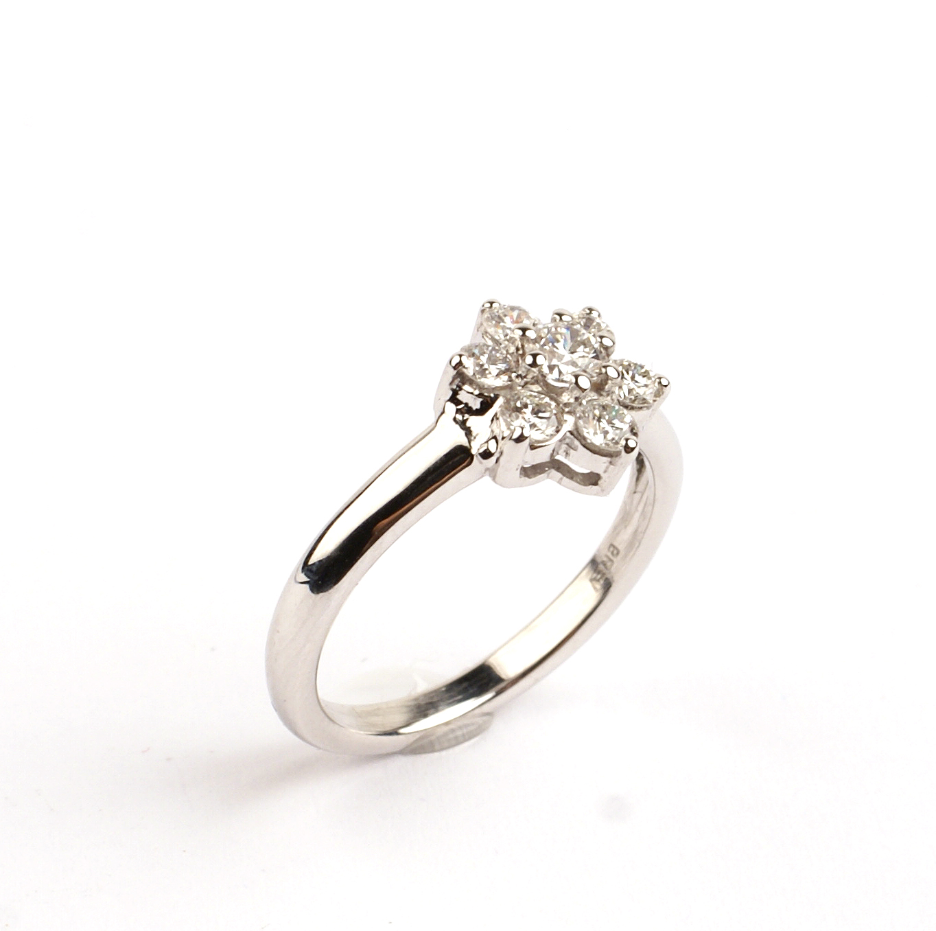 ANELLO A MOTIVO FLOREALE in oro bianco 18kt con diamanti taglio brillante per 0,58 punti circa, misura 14 4,2 gr.