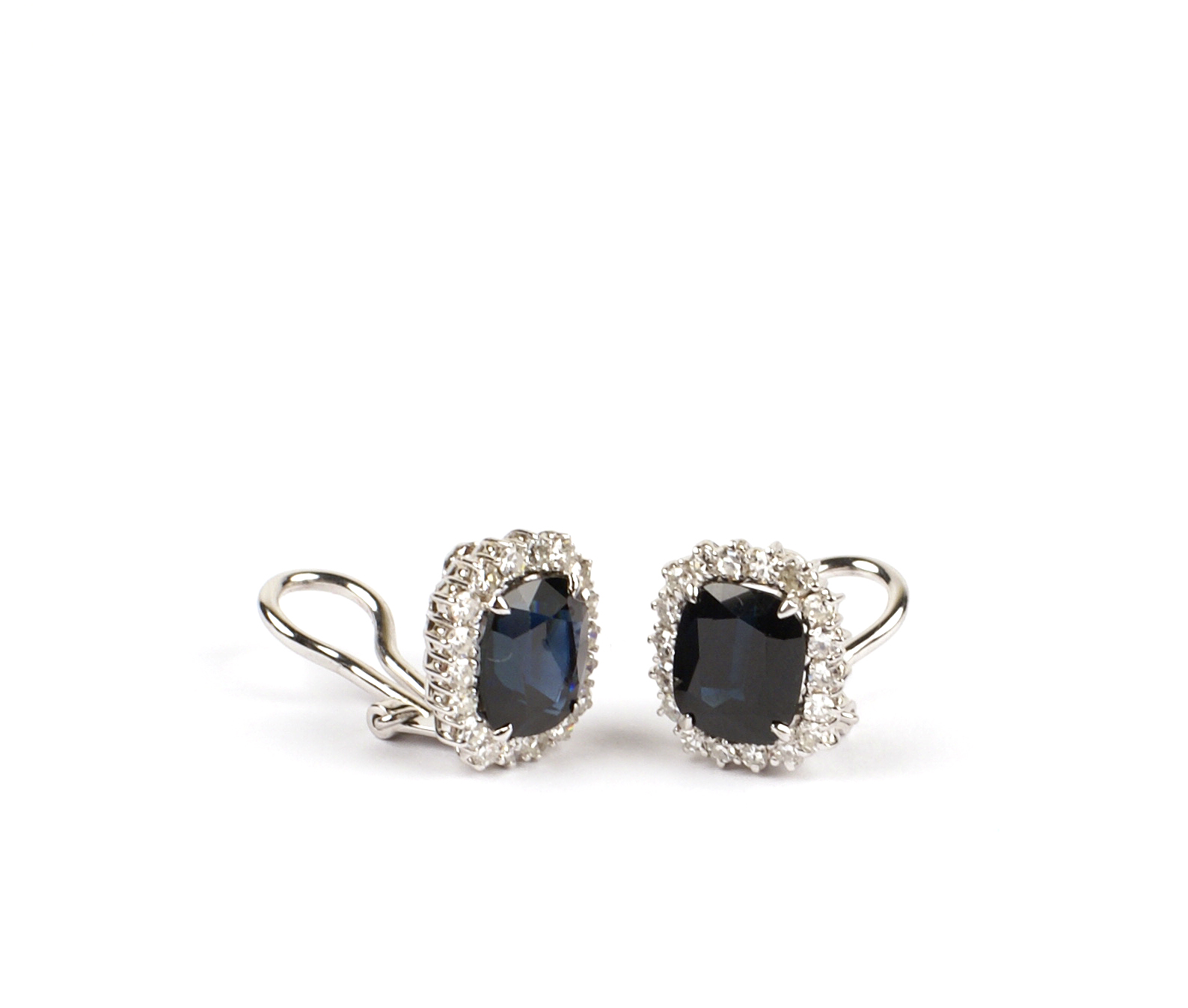 ORECCHINI A LOBO IN ORO BIANCO 18KT con due zaffiri ovali per ct 4 circa circondati da diamanti taglio brillante per 0,70 punti circa 7 gr.