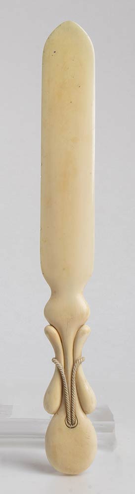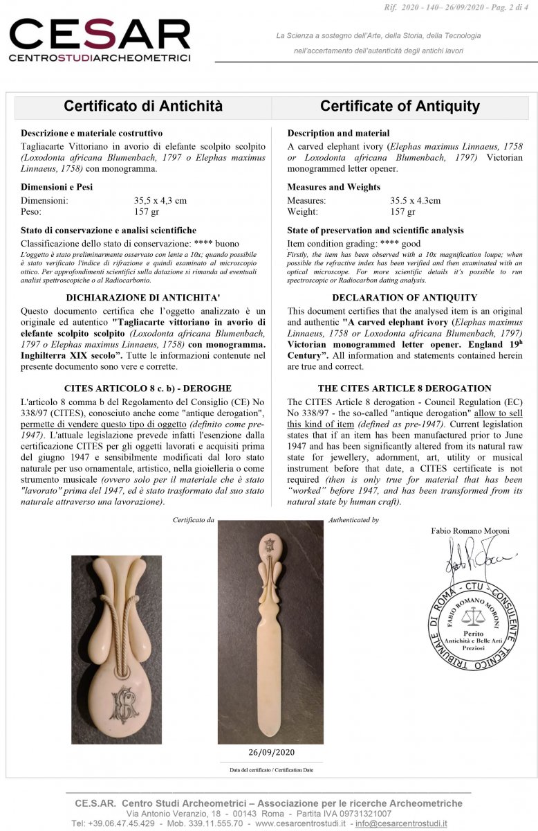 in avorio di elefante (Loxodonta africana Blumenbach, 1797 o Elephas maximus Linnaeus, 1758) scolpito con monogramma. Dimensioni 35,5 x 4,3 cm. Peso 157 gr. Stato di conservazione: **** buono. Accompagnato da certificato di antichità Ce.S.Ar. Centro Studi Archeometrici (pre-1947). uesto lotto contiene avorio/corallo/tartaruga o altre specie protette dalla regolamentazione CITES (the Convention on International Trade in Endangered Species of Wild Fauna and Flora). A causa dei recenti cambiamenti nella legislazione di molti paesi (ad es. USA o Cina) sulle specie in via di estinzione tra cui corallo, avorio e tartaruga - BFA raccomanda agli acquirenti di verificare con il proprio governo eventuali requisiti di importazione prima di effettuare un'offerta. Ad esempio, le normative statunitensi limitano l'importazione di avorio di elefante; BFA non assisterà quindi gli acquirenti nella spedizione di questo lotto negli Stati Uniti. Chi fosse interessato è pregato di mettersi in contatto con i nostri uffici prima dell'asta CITES ARTICOLO 8 c. b) – DEROGHE L'articolo 8 comma b del Regolamento del Consiglio (CE) No 338/97 (CITES), conosciuto anche come ""antique derogation"", permette di vendere questo tipo di oggetto (definito come pre-1947). L'attuale legislazione prevede infatti l'esenzione dalla certificazione CITES per gli oggetti lavorati e acquisiti prima del giugno 1947 e sensibilmente modificati dal loro stato naturale per uso ornamentale, artistico, nella gioielleria o come strumento musicale (ovvero solo per il materiale che è stato ""lavorato"" prima del 1947, ed è stato trasformato dal suo stato naturale attraverso una lavorazione). Il certificato gemmologico è disponibile a pagamento dopo l'asta
