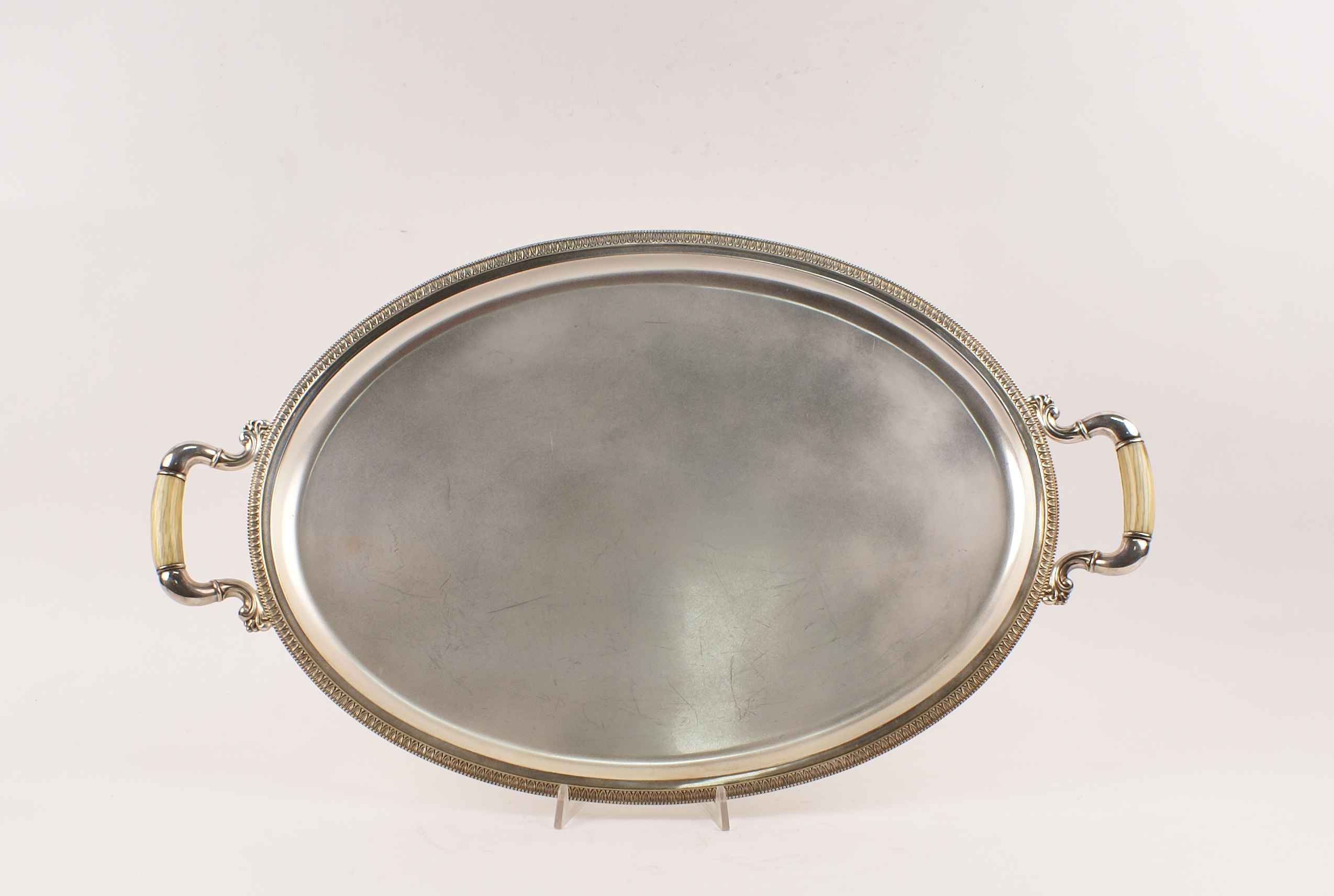VASSOIO IN ARGENTO DI FORMA OVALE manifattura italiana con profilo decorato a motivo di palmette e due manici sagomati con inserti in avorio, cm. 64x38 1910 gr.