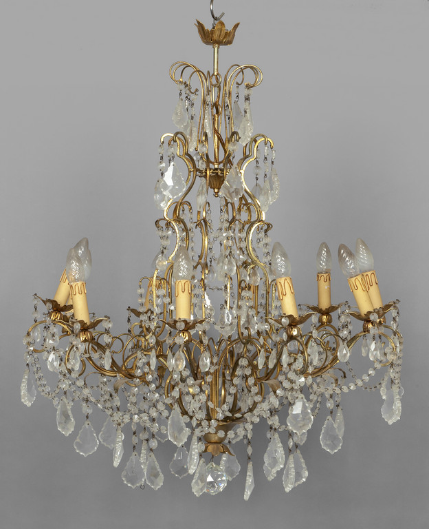 Lampadario in bronzo dorato e cristalli a dieci luci
