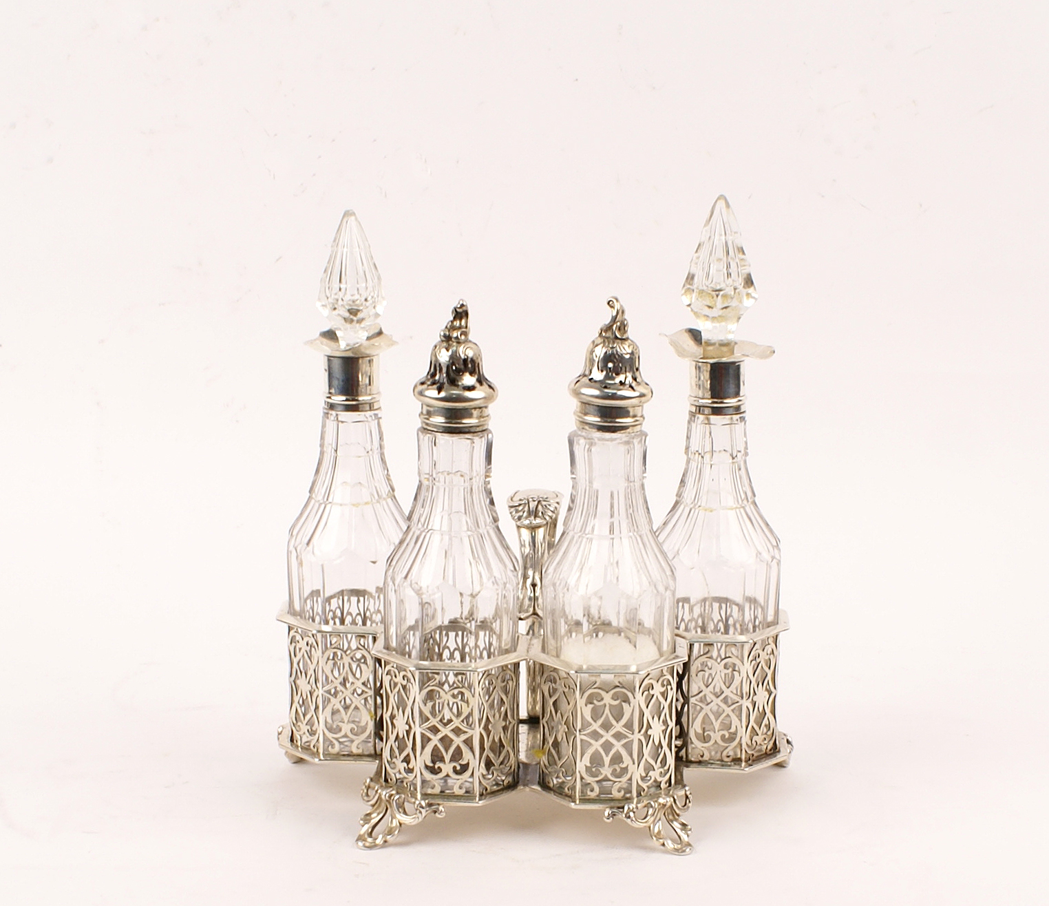 OLIERA IN ARGENTO CON QUATTRO AMPOLLE IN CRISTALLO Londra 1846 cestelli traforati poggianti su piedini a voluta, manico sagomato (un tappo lievi difetti), cm. 22x20x13 440 gr.