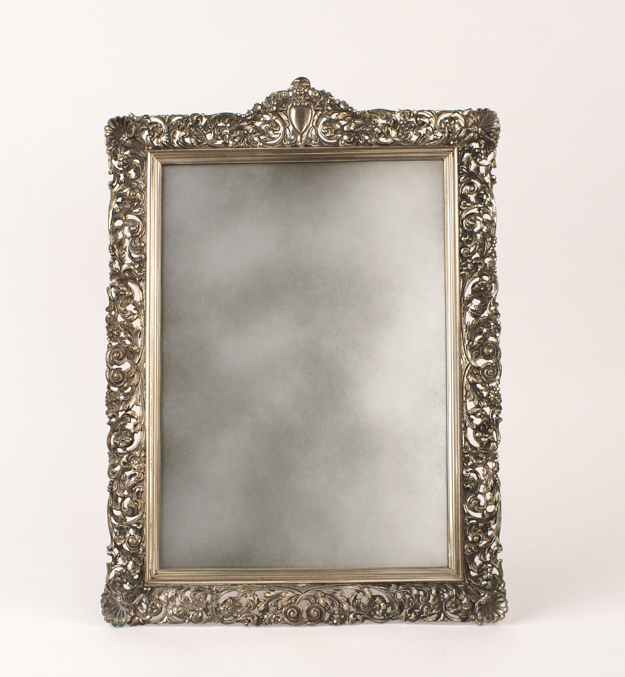 SPECCHIERA DA TAVOLO CON CORNICE IN ARGENTO vecchia manifattura di forma rettangolare sbalzata a motivi floreali e di volute, cm. 41,5x32,5 640 gr.