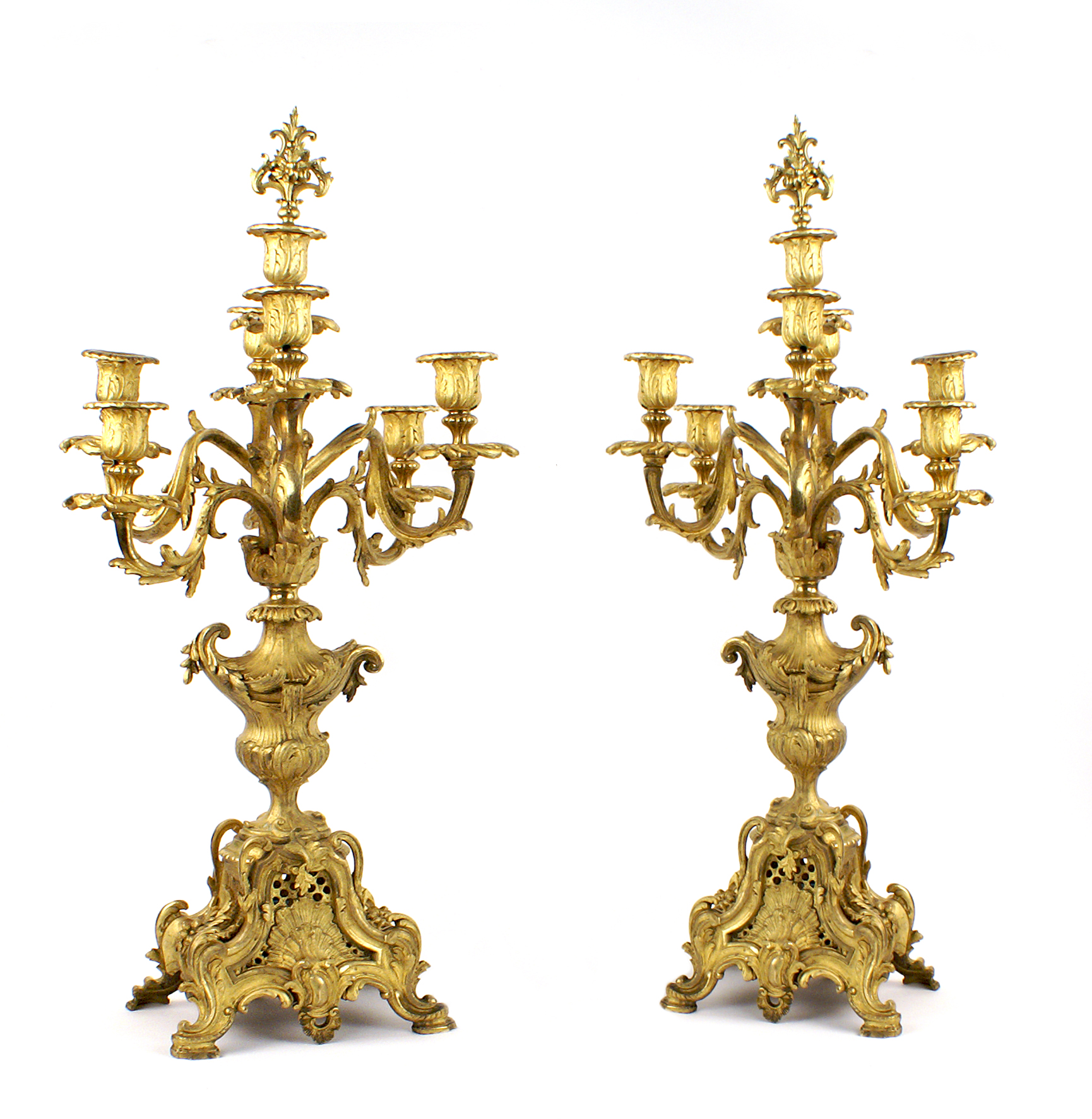 COPPIA DI CANDELABRI IN BRONZO DORATO A SETTE LUCI Francia, fine del XIX Sec. finemente cesellati e decorati a motivo di volute, poggianti su basi sagomate h. 83,5 cm.