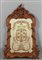 Cornice umbertina in legno intagliato naturale con all'interno ricamo arricchito da medaglie, fine sec.XIX