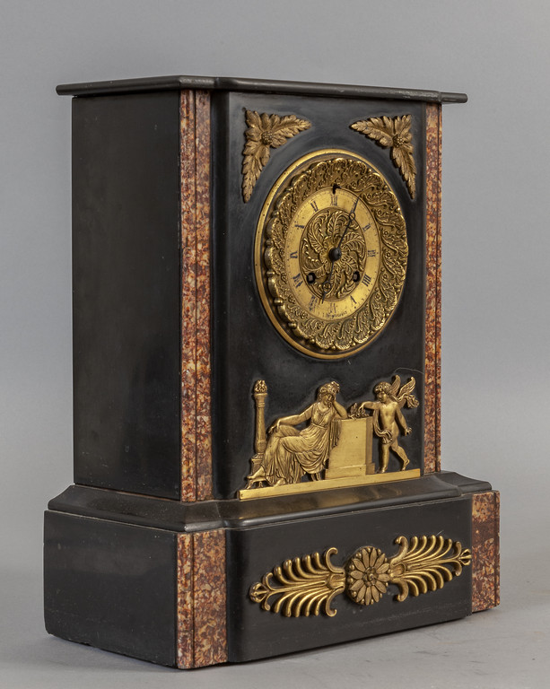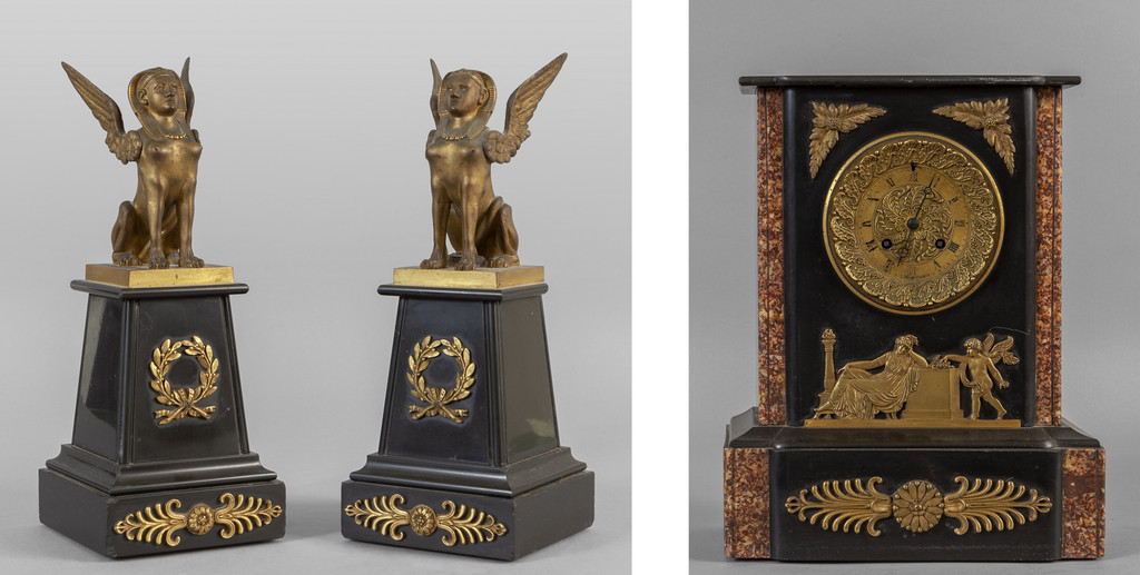 Trittico da camino in marmo nero, broccatello di Spagna e bronzo dorato, Francia sec.XIX