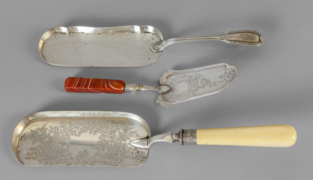 Tre palette da dolce in argento di cui una con manico in agata inizi sec.XX