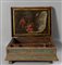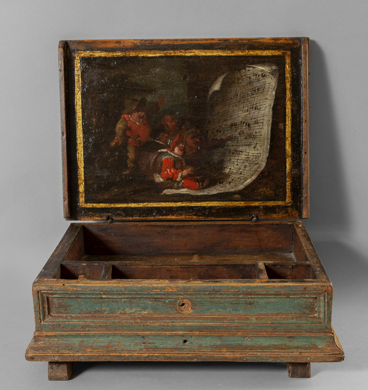 Scatola in legno laccato con all'interno dipinto di scuola bresciana del sec.XVII raffigurante nani musicanti