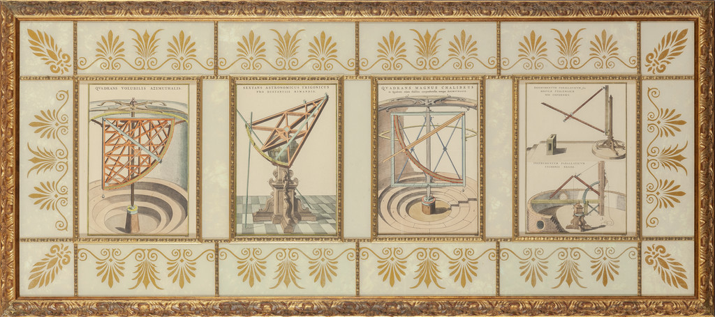 Pannello con all'interno quattro stampe raffiguranti strumenti scentifici