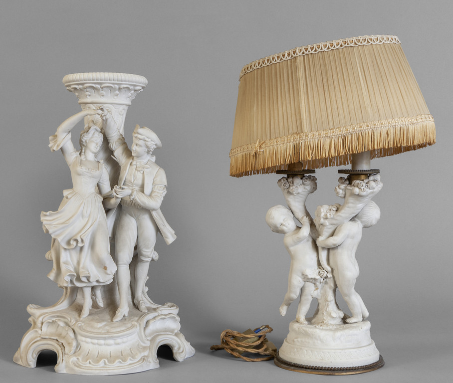 Due lampade in biscuit, inizi sec.XX<br>h.cm.32 e