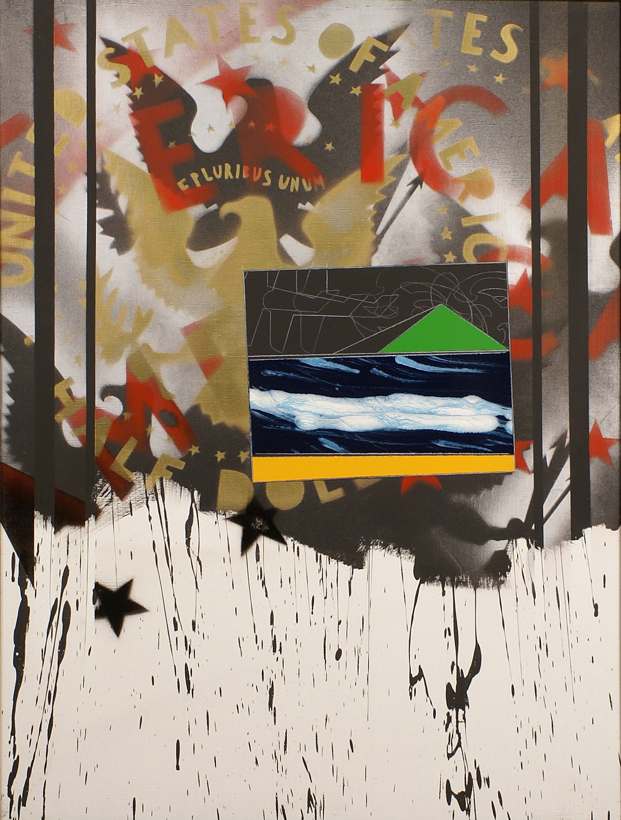 FRANCO ANGELI Roma 1935 - 1998 Of America anni 80, acrilico su tela, firma e titolo sul retro, opera archiviata con il n. ABBBCC0703, entro cornice 80X60 cm.