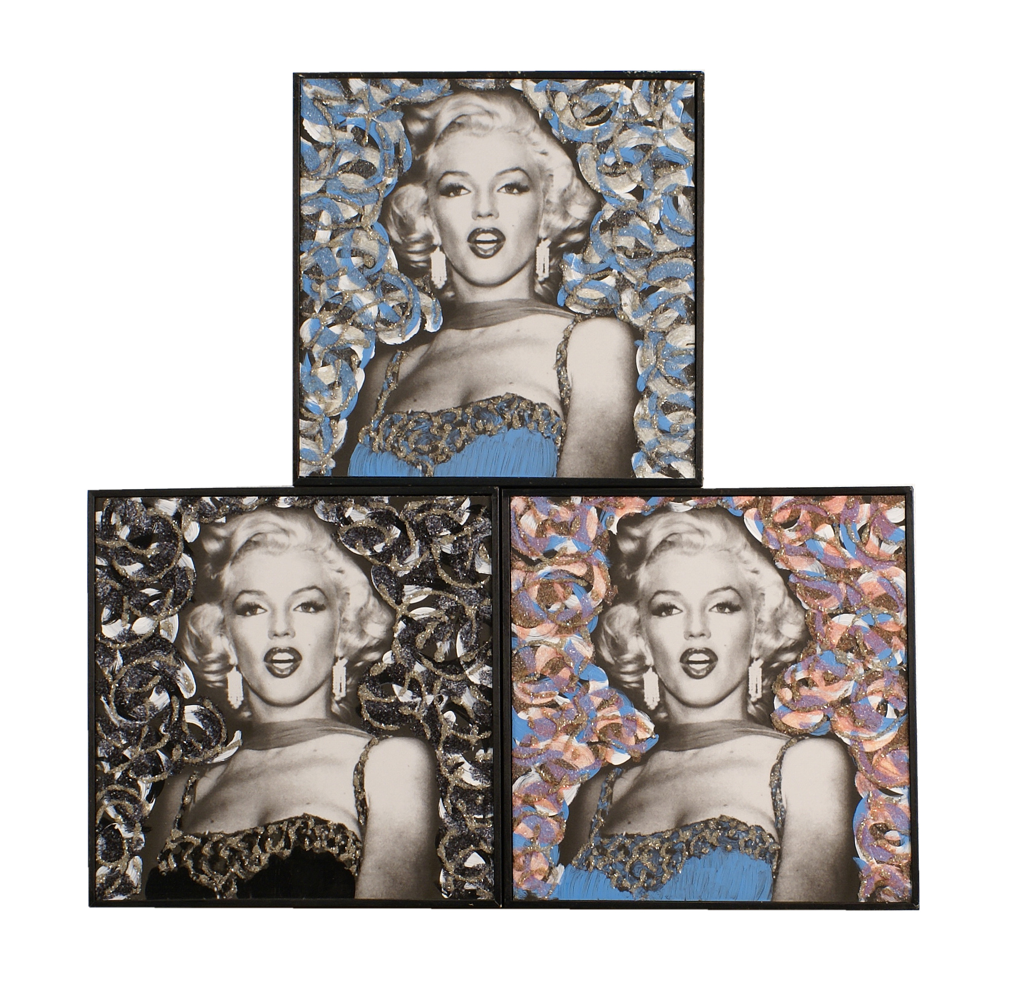 FRANCESCO BRUSCIA Fano 1973 Marilyn anno 2008, tre fotografie ritoccate con acrilici, foglia d'oro e argento e glitters, firma e certificati di autentica sul retro, entro cornici