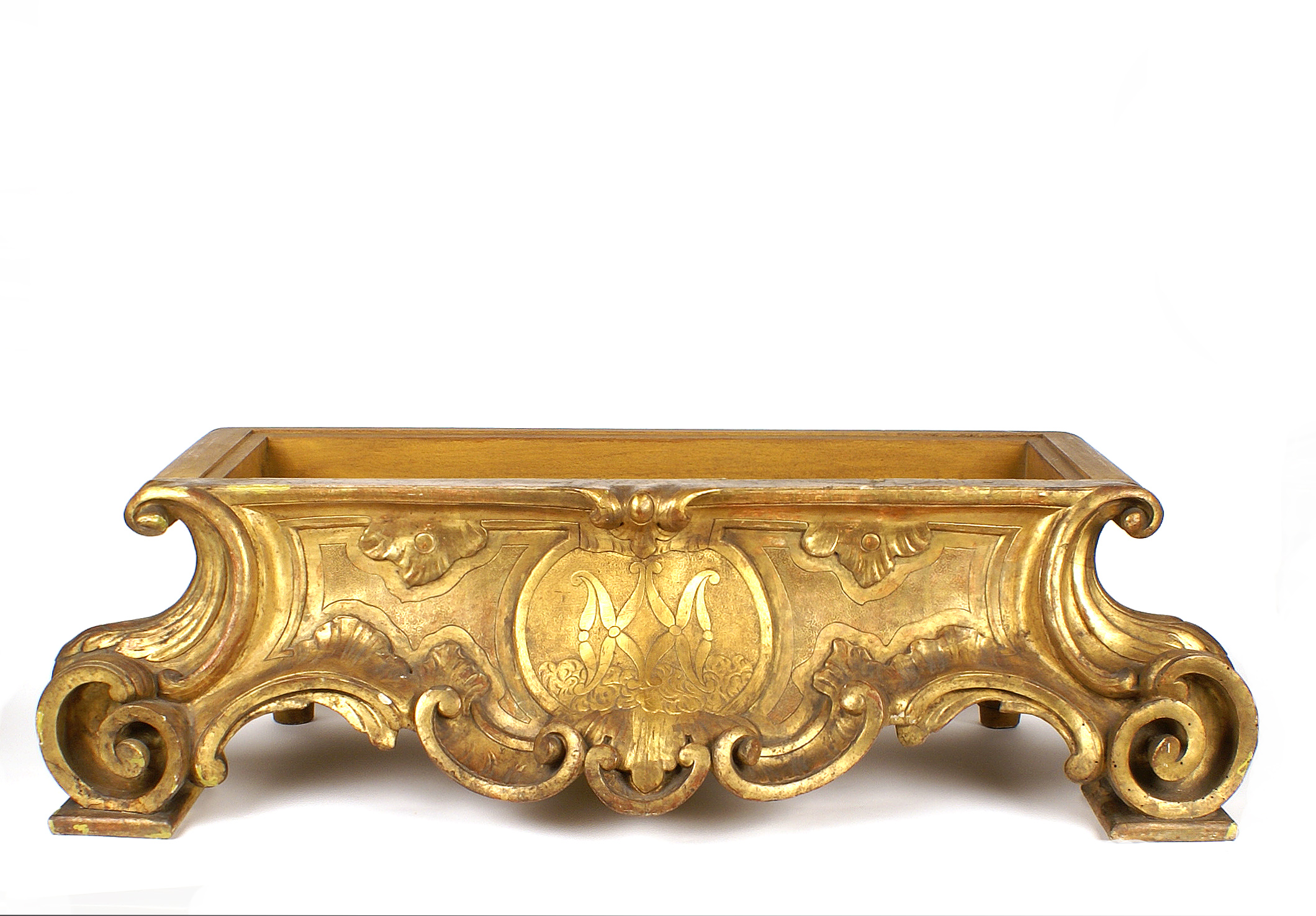 FIORIERA IN LEGNO vecchia manifattura dorato ed intagliato a motivo vegetale e di volute cm. 30x105x39