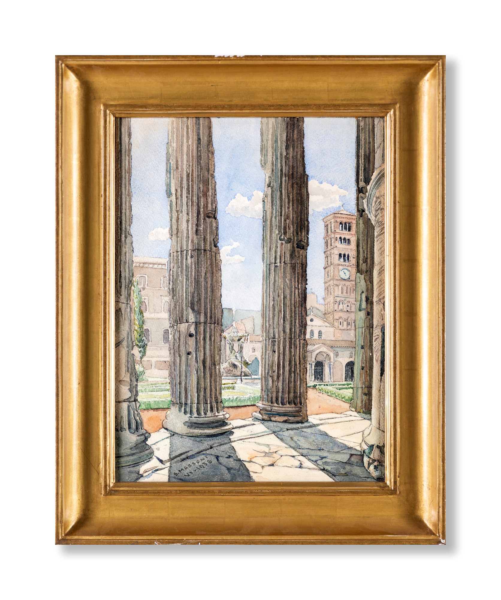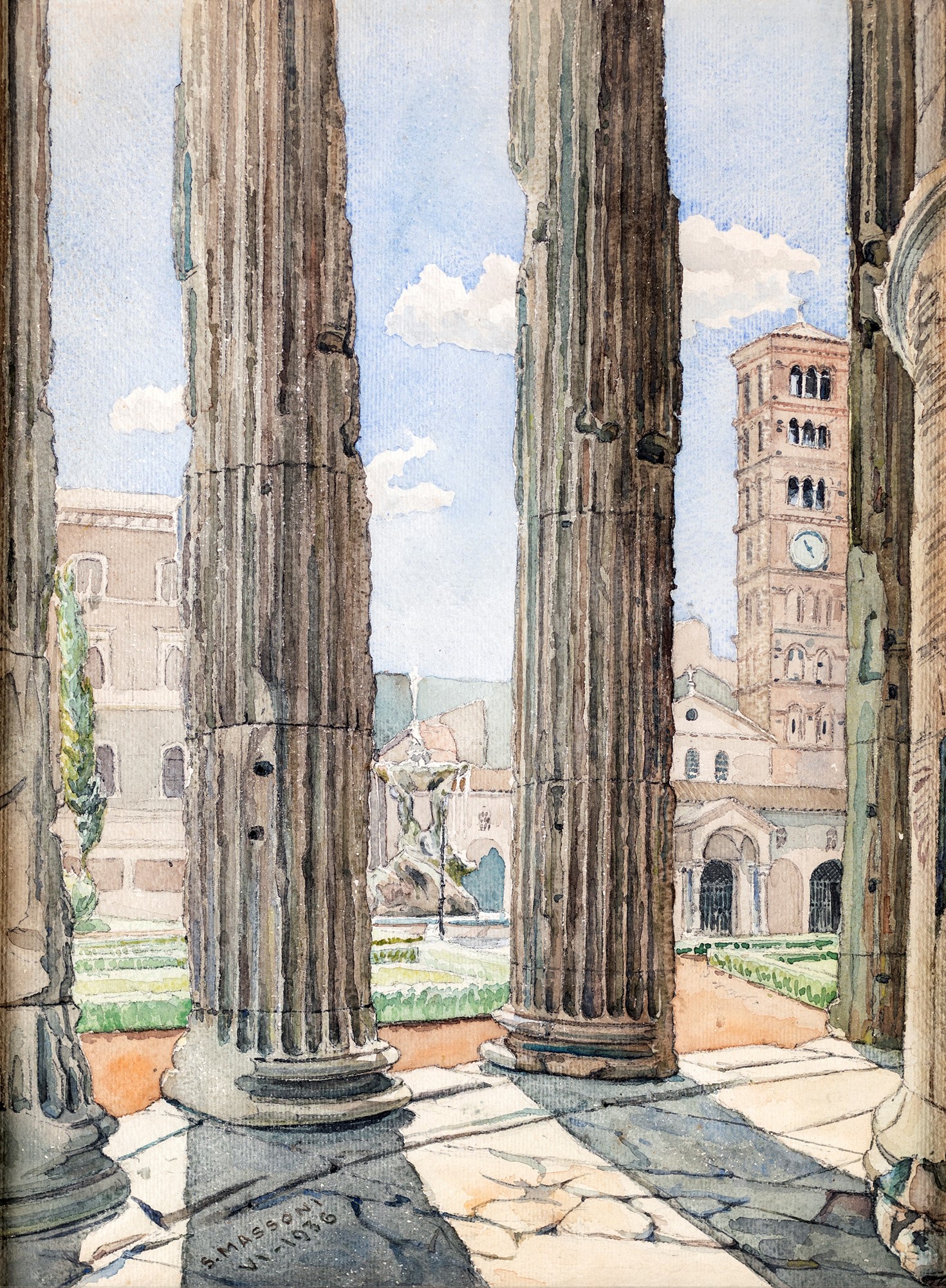 Pittore degli inizi del XX secolo - Scorcio della Basilica di Santa Maria in Cosmedin dalle colonne del tempio di Ercole vincitore - Firmato e datato in basso a sinistra: S. Massoni - VI 1936 - acquerello su carta - cm 50x37