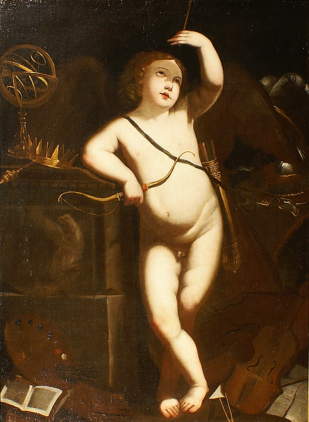 SCUOLA ROMANA primo quarto del XVII Sec. Cupido, olio su tela, entro cornice coeva in legno ebanizzato e parzialmente dorato Dim. 130x96 cm.