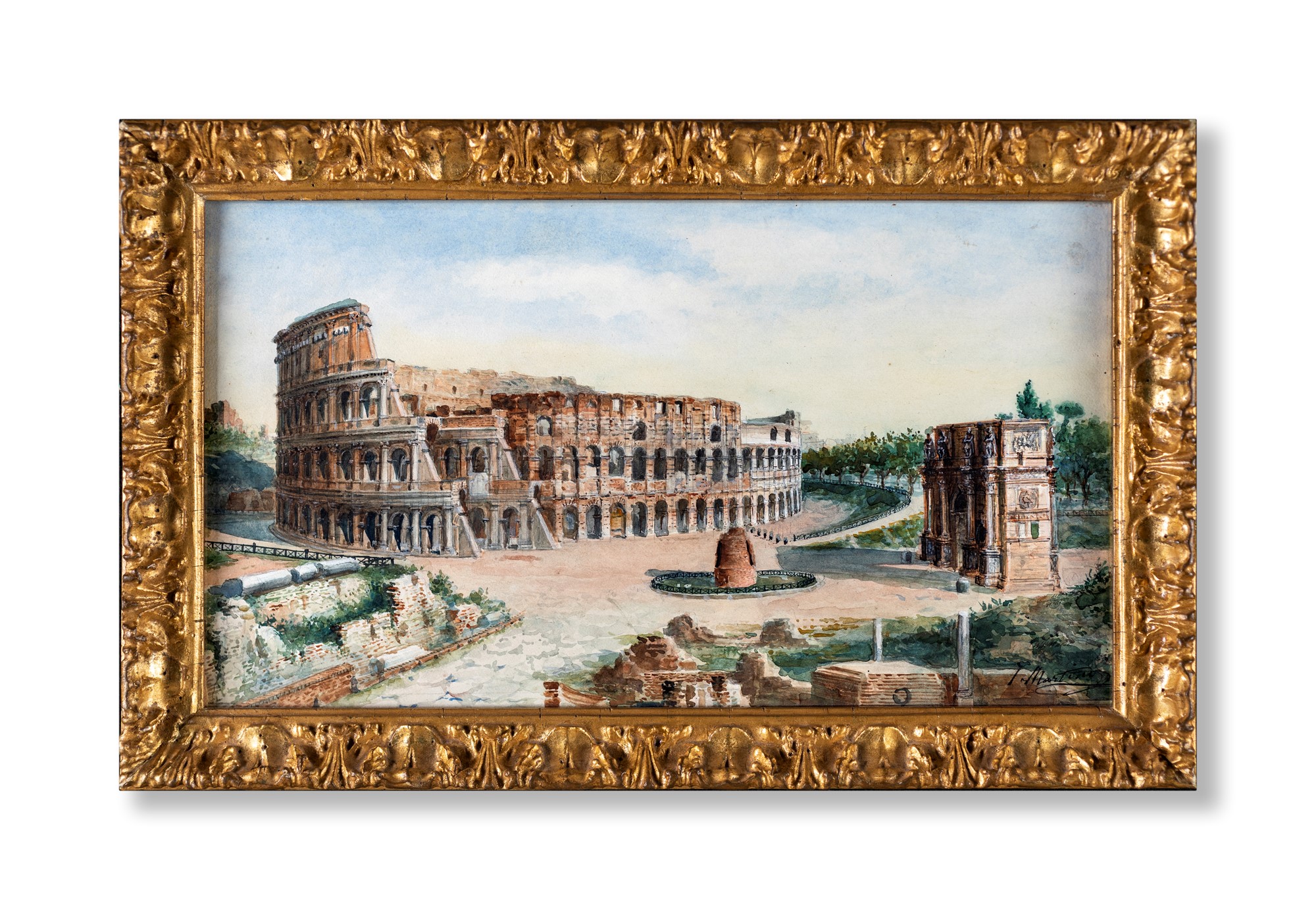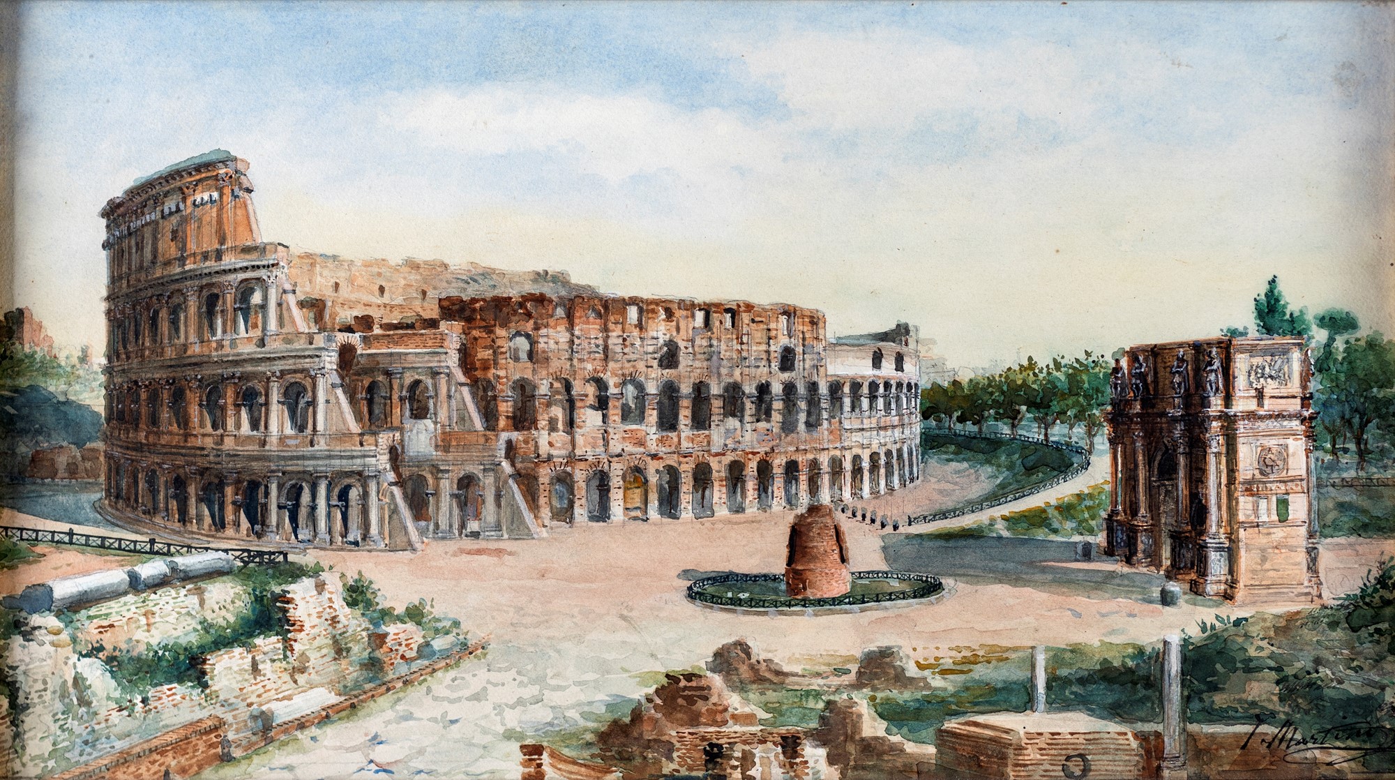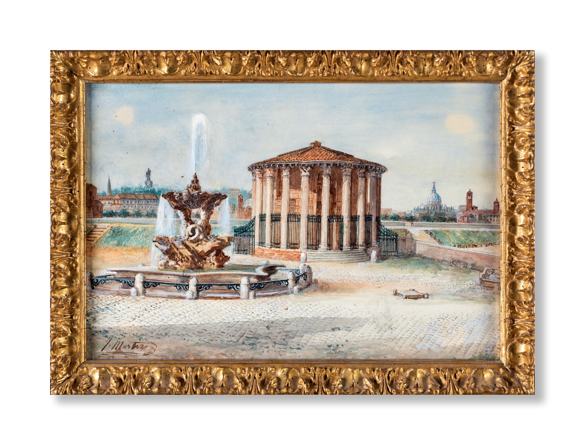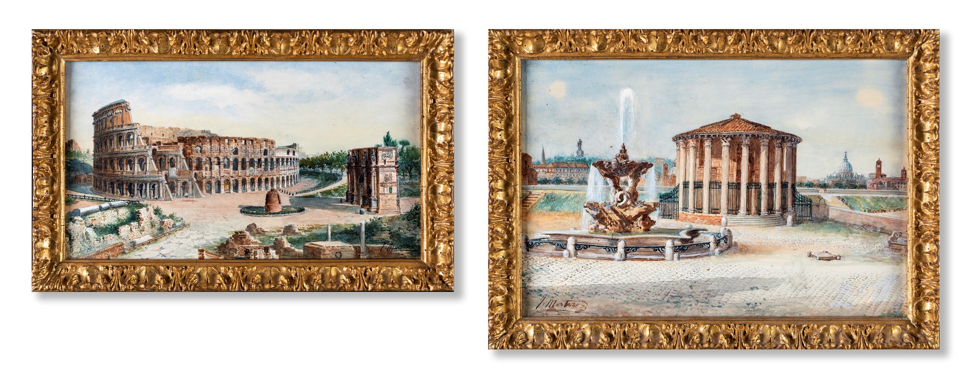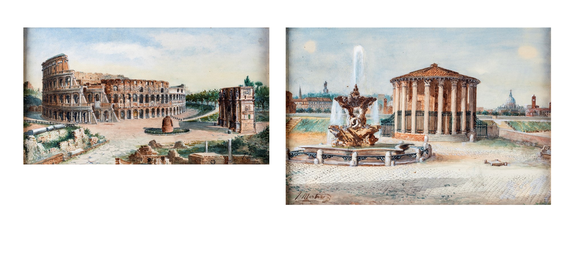 Juan Jiménez Martin (noto anche come Martino Del Don) - a) Veduta del Colosseo con l'Arco di Costantino e la Meta Sudans b) Il Tempio di Ercole vincitore al Foro Boario e la fontana dei Tritoni di Carlo Bizzaccheri - Entrambi firmati in basso J. Martino rispettivamente a destra e a sinistra. - due acquerelli su carta - cm 21x38 e cm 28x41 rispettivamente