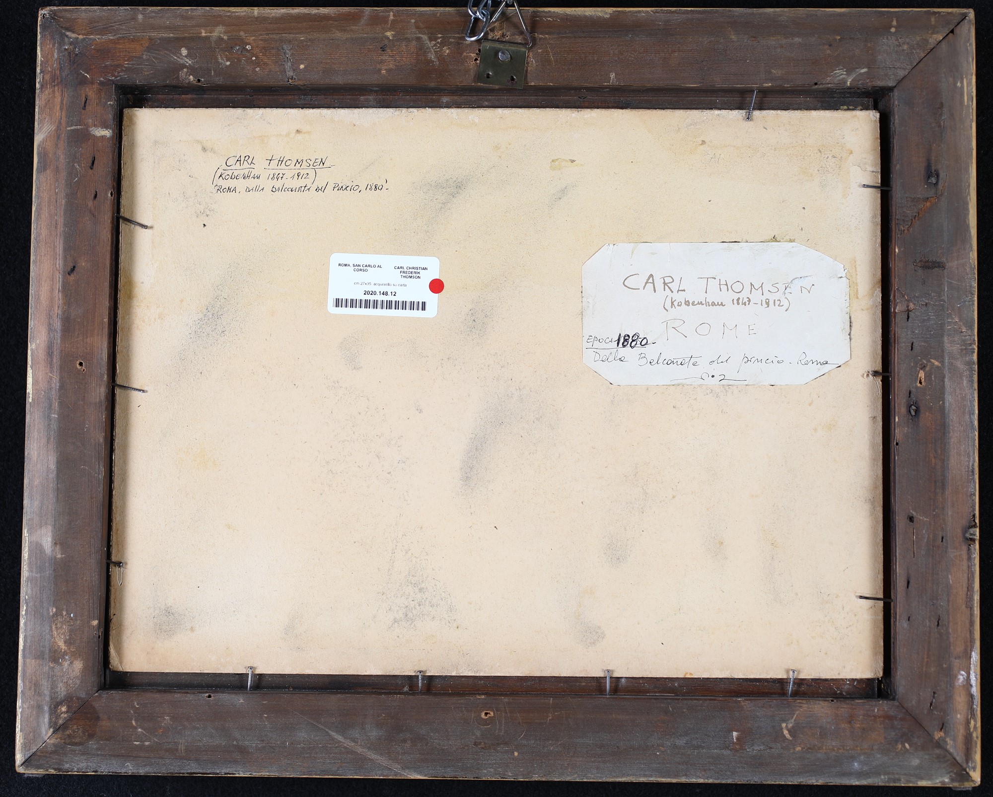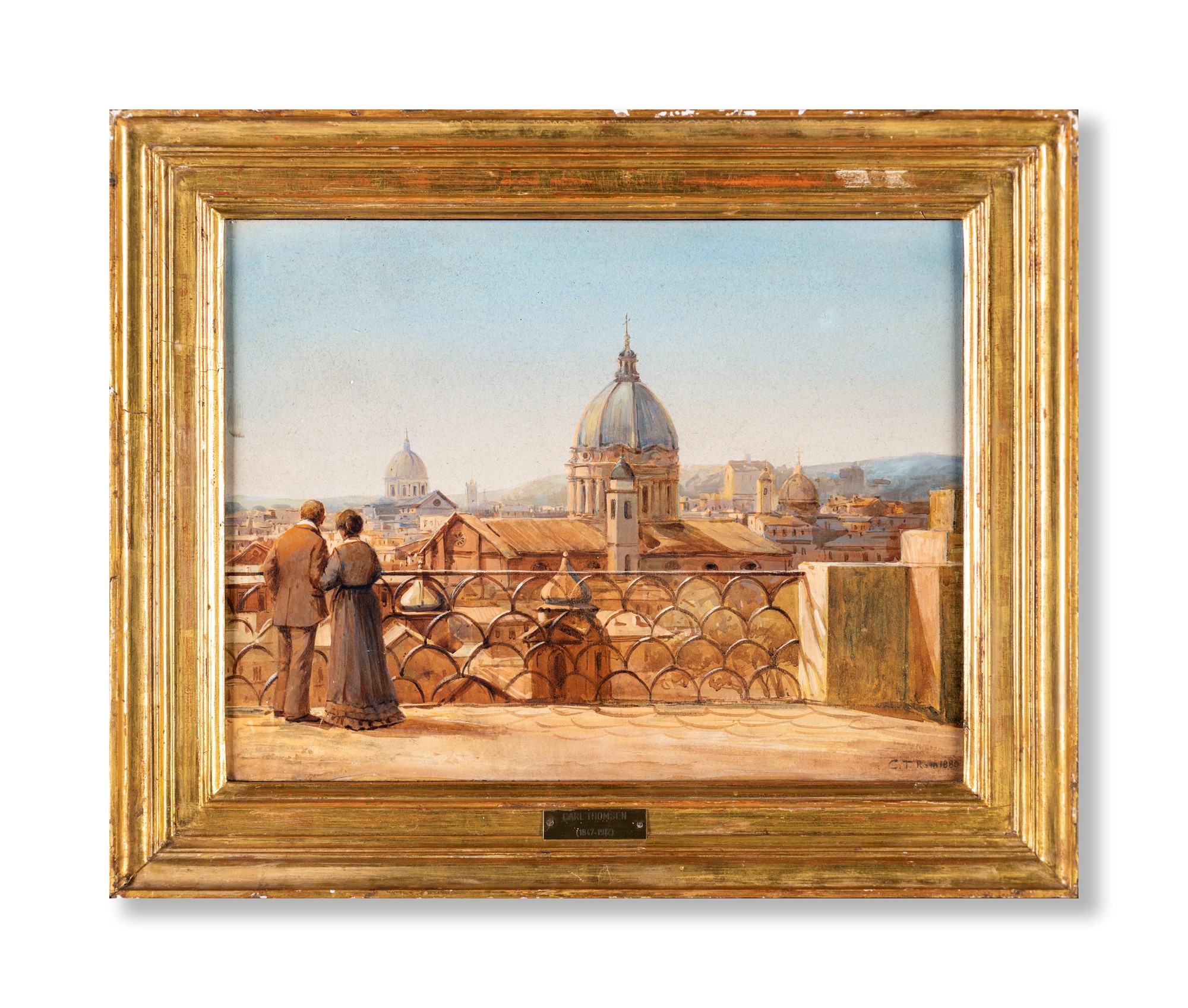 Carl Christian Frederik Thomsen - Tetti di Roma con San Carlo al Corso - Siglato e datato in basso a destra: C.T. Roma 1880. Veduta presa dalla strada sopra la scalinata di Trinità dei Monti, tra l'obelisco e Villa Medici, in un punto attualmente occupato da un bar con terrazza panoramica - acquerello su carta - cm 27x35