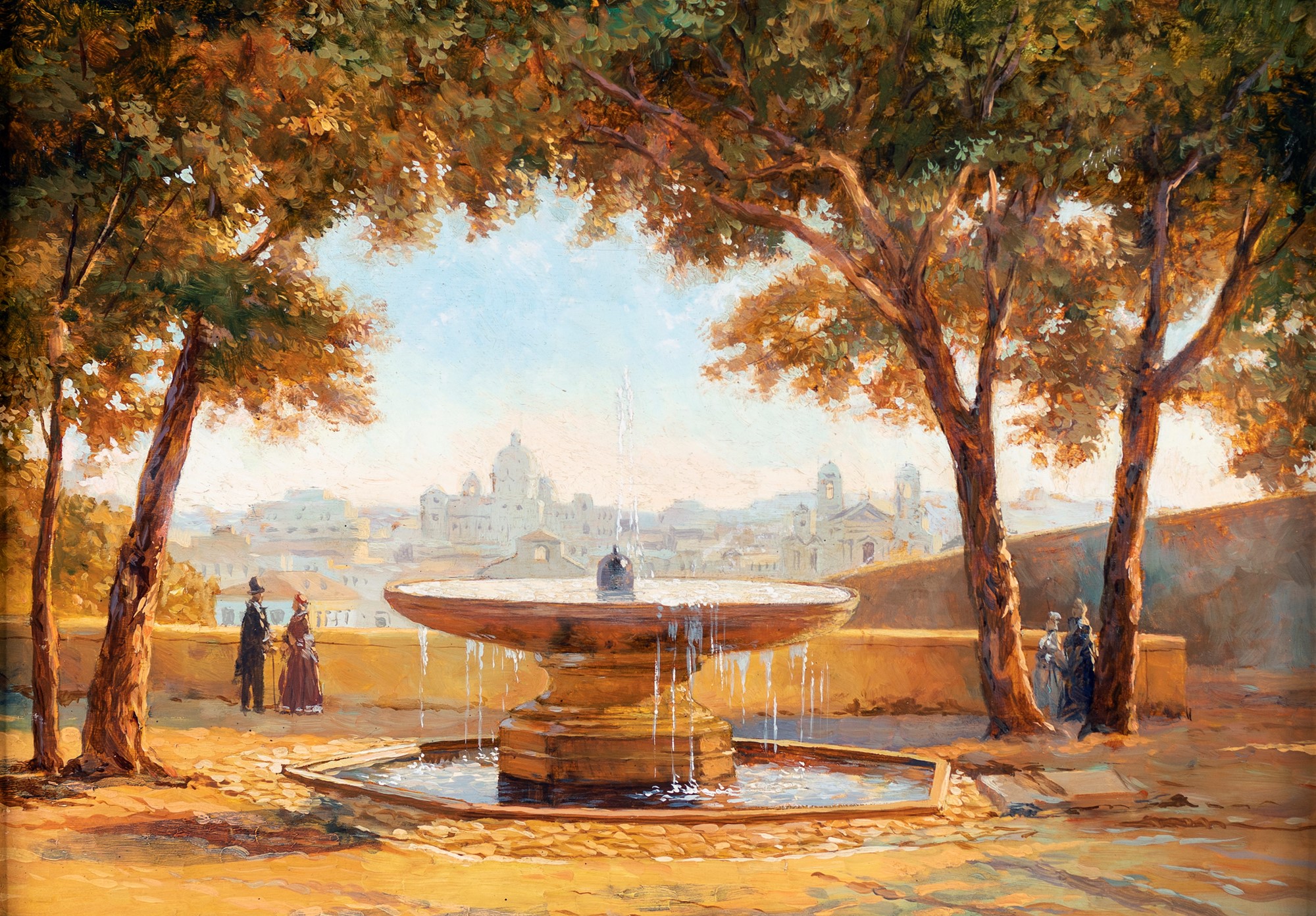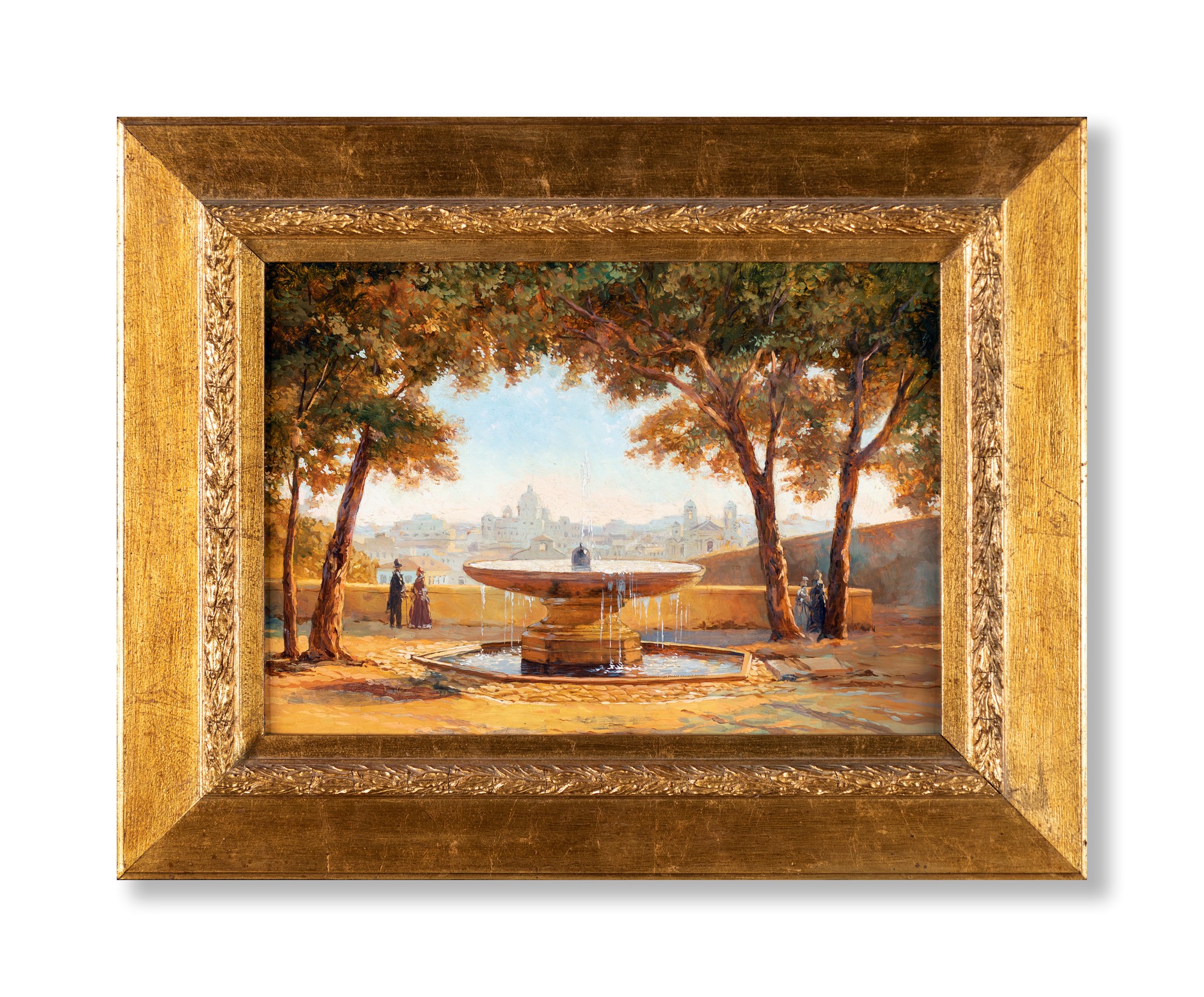 Pittore del XX secolo - La fontana della palla di cannone davanti a Villa Medici sul Monte Pincio - olio su tavola - cm 32x45