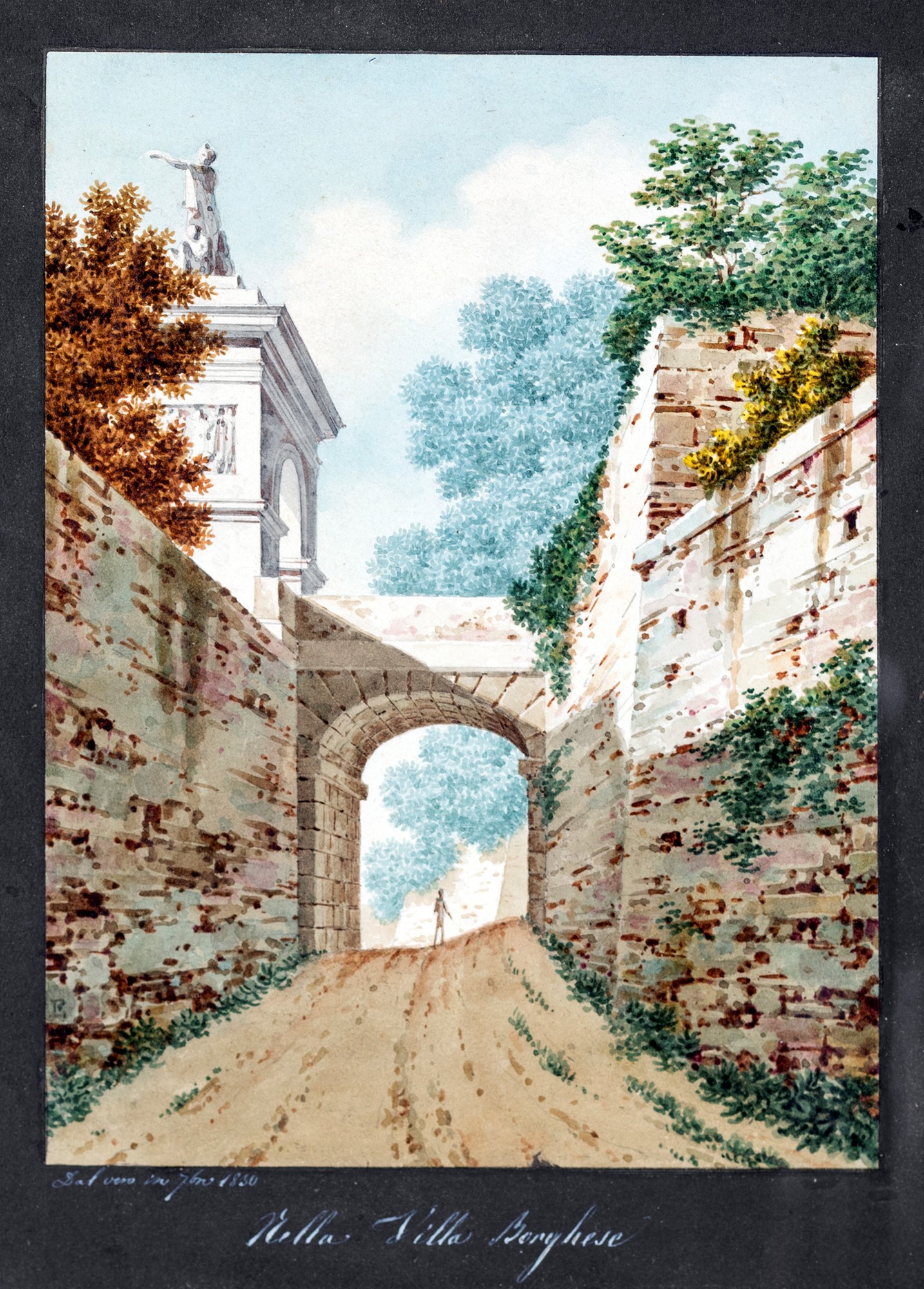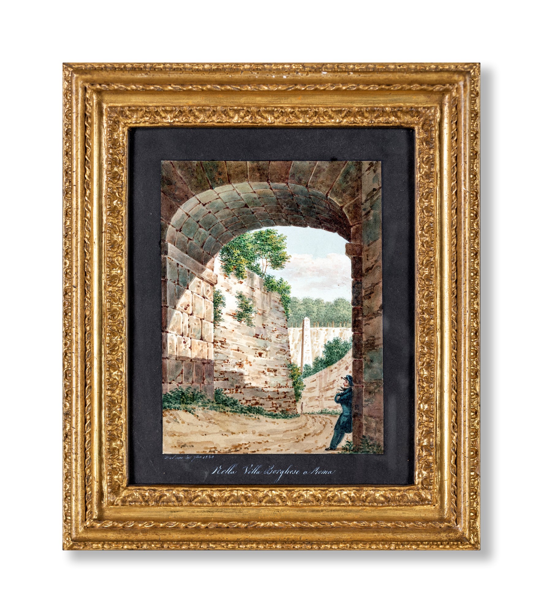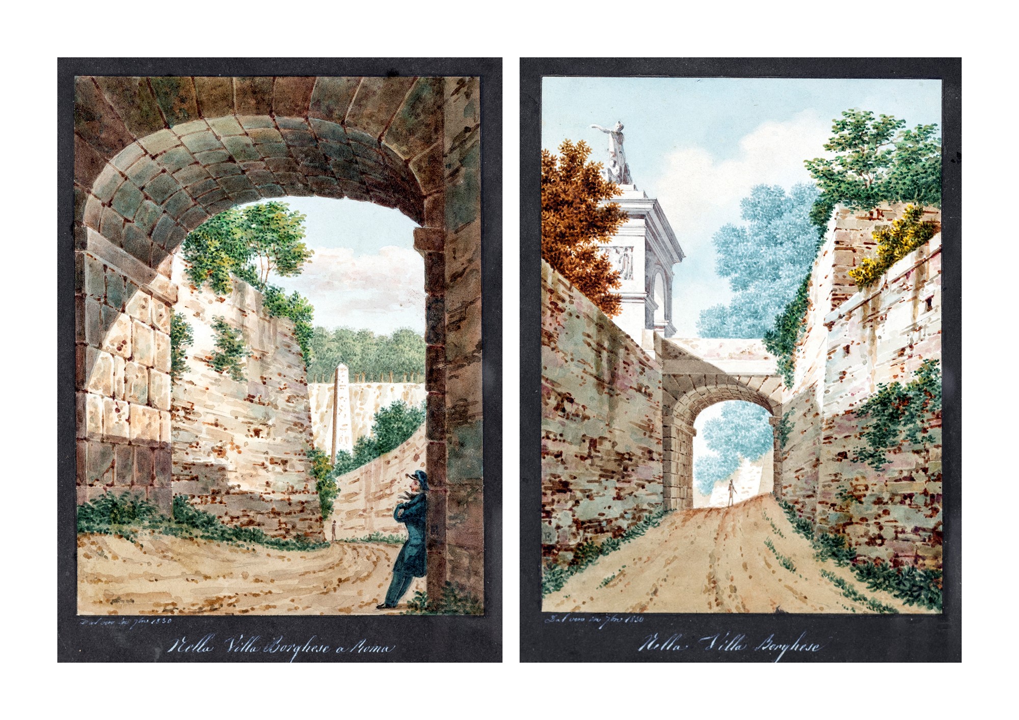 Pittore del XIX secolo - Scorci di Villa Borghese - Iscritto in basso sul passe partout: Villa Borghese dal vero, 1830 - coppia di acquerelli su carta - cm 17,5x13,5