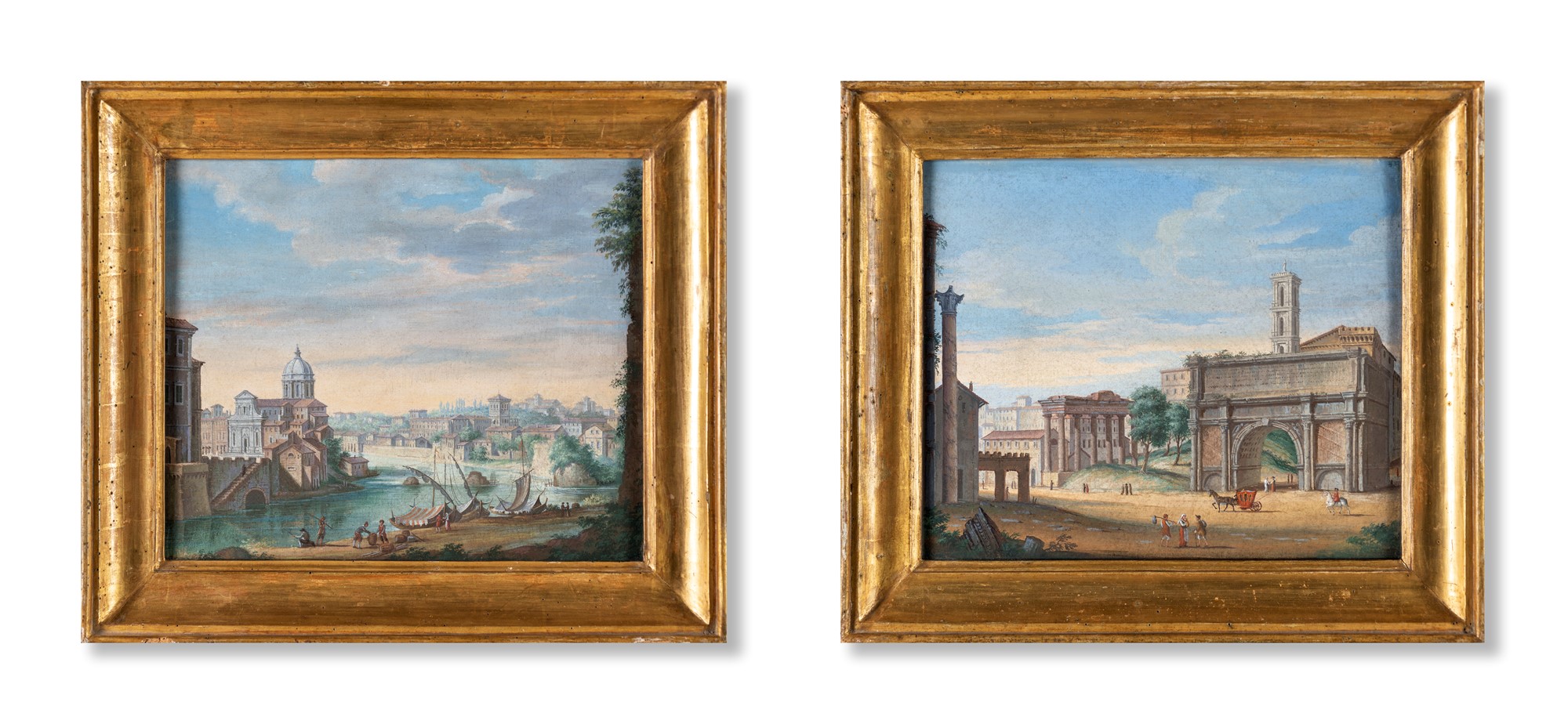 Pittore fine del XIX secolo - a) Veduta del Tevere con la basilica di San Giovanni dei Fiorentini e l'Isola Tiberina b) Veduta del Foro Romano con la colonna di Foca, i resti del tempio di Saturno e l'arco di Tito - coppia di tempere su carta - cm 43x35