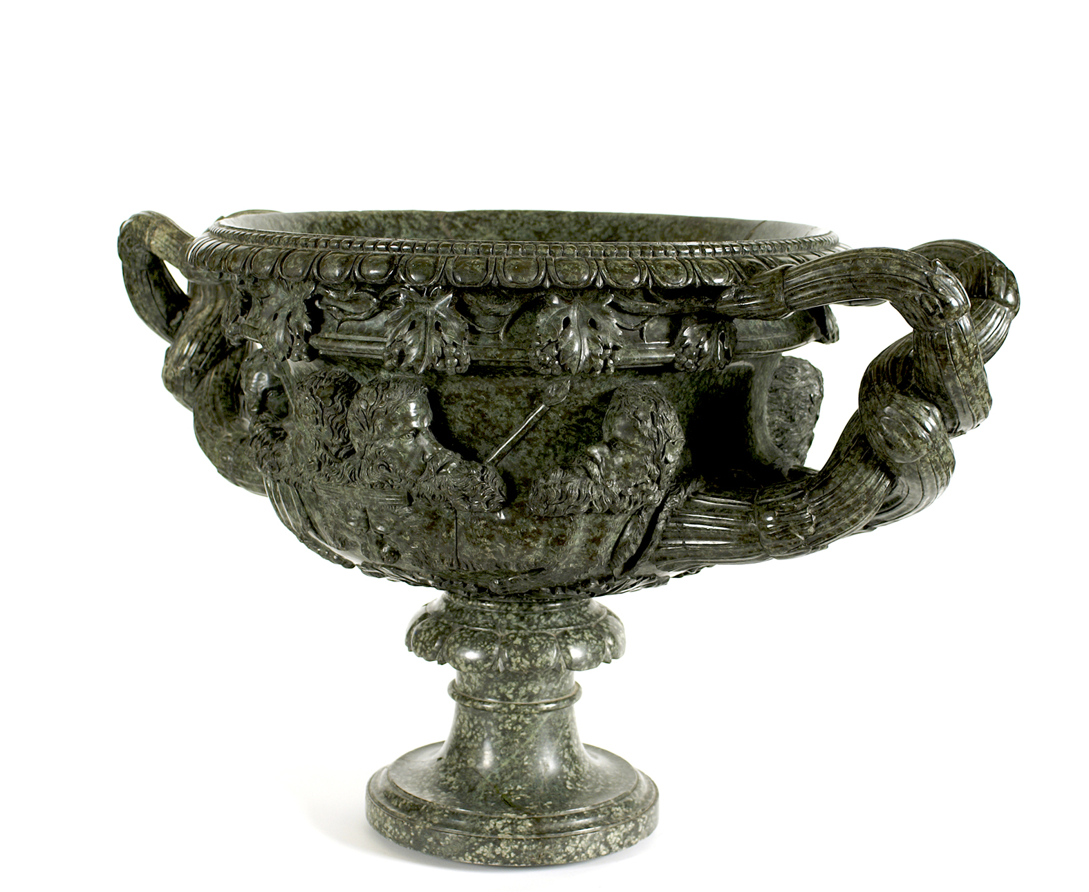 BENEDETTO BOSCHETTI, ATTRIBUITO A Roma 1820 - 1860 Vaso Warwick grande vaso in marmo verde di Prato con decoro a rilievo costituito da maschere bacchiche e da tralci di vite, anse a spirale, poggiante su colonna in marmo di epoca successiva h. cm.102 (Il vaso presenta mancanze e restauri ) Il modello è ispirato al celebre vaso Warwick oggi conservato alla casa museo "The Burrel Collection" di Glasgow. Nel 1771 Gavin Hamilton, un inglese che viveva a Roma e che conduceva gli scavi archeologici sull'area della Villa Adriana a Tivoli, riportò alla luce un vaso colossale decorato a maschere bacchiche, venduto rapidamente a un omonimo del fortunato scopritore, Sir William Hamilton (1730-1803) ambasciatore britannico a Napoli che ne affidò il restauro a Giovanni Battista Piranesi e all'inglese James Byres. Piranesi lo illustrerà ben tre volte nel suo volume di incisioni intitolato "Vasi, candelabri, cippi..."del 1778. Quando Hamilton lo cede, nel 1778, al nipote George Grenville, secondo conte di Warwick (che gli darà il nome) le proteste sono molte. Il vaso lascia l'Italia e presto cominciano a prodursi moltissime copie. 44x85x58 cm.