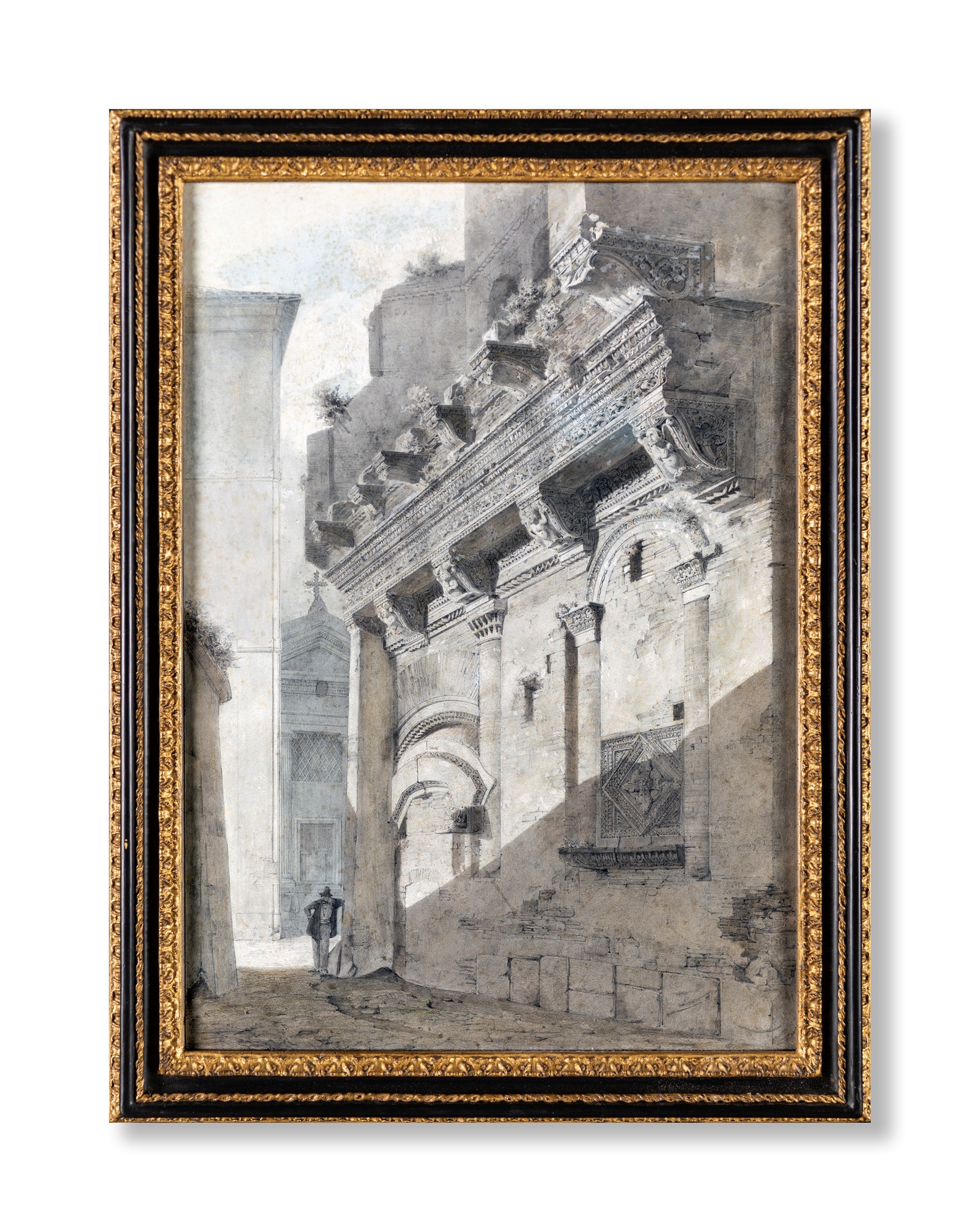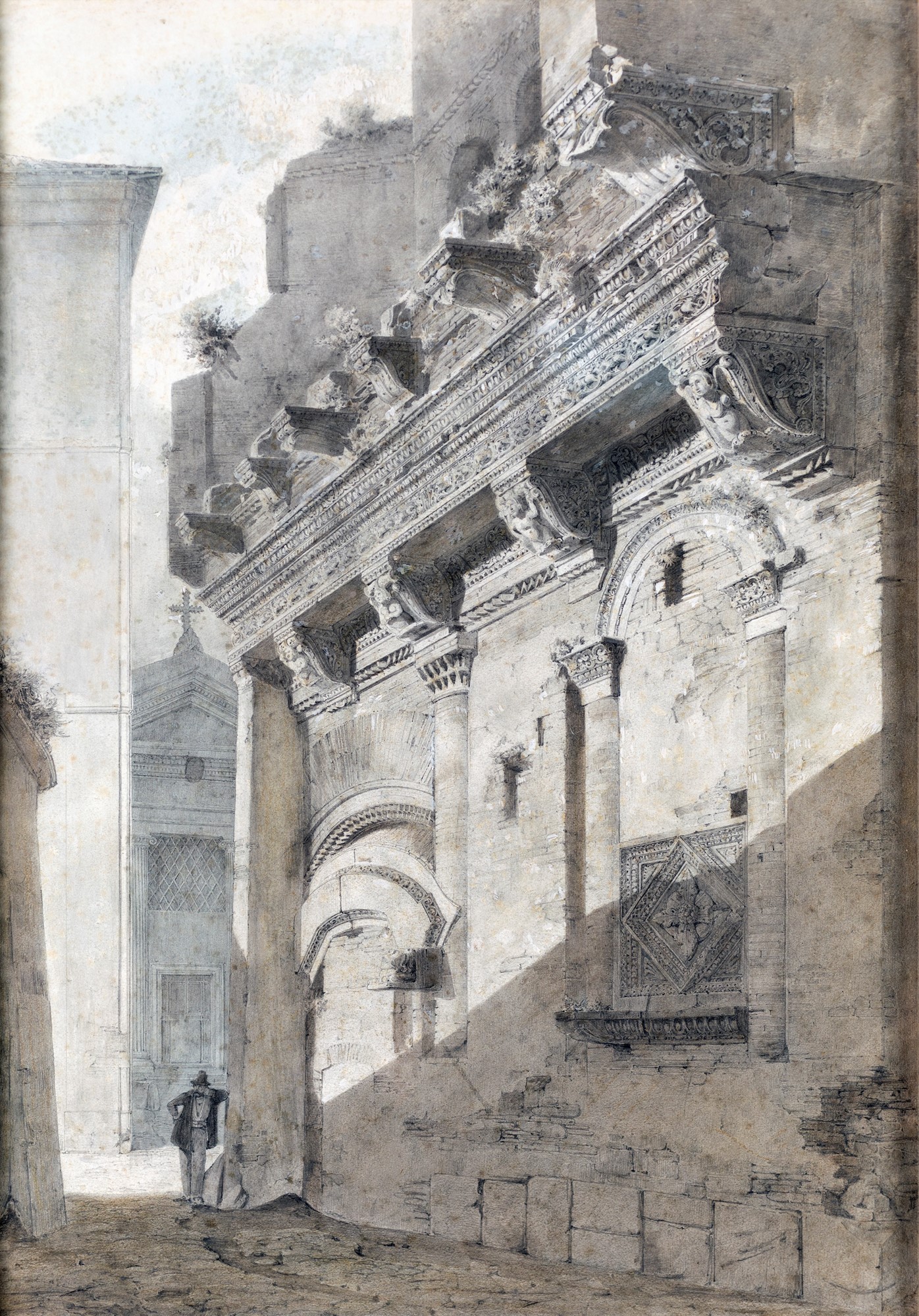 Carl Ferdinand Sprosse - La casa dei Crescenzi (o Tor Crescenzia) al Foro Boario - Firmato in basso a destra. Edificata tra il 1040 e il 1065, deve il suo nome alla aristocratica famiglia romana dei Crescenzi che in pieno Medioevo riscuoteva i pedaggi per i moli sul Tevere. - matita e acquerello monocromo su carta - cm 45x36