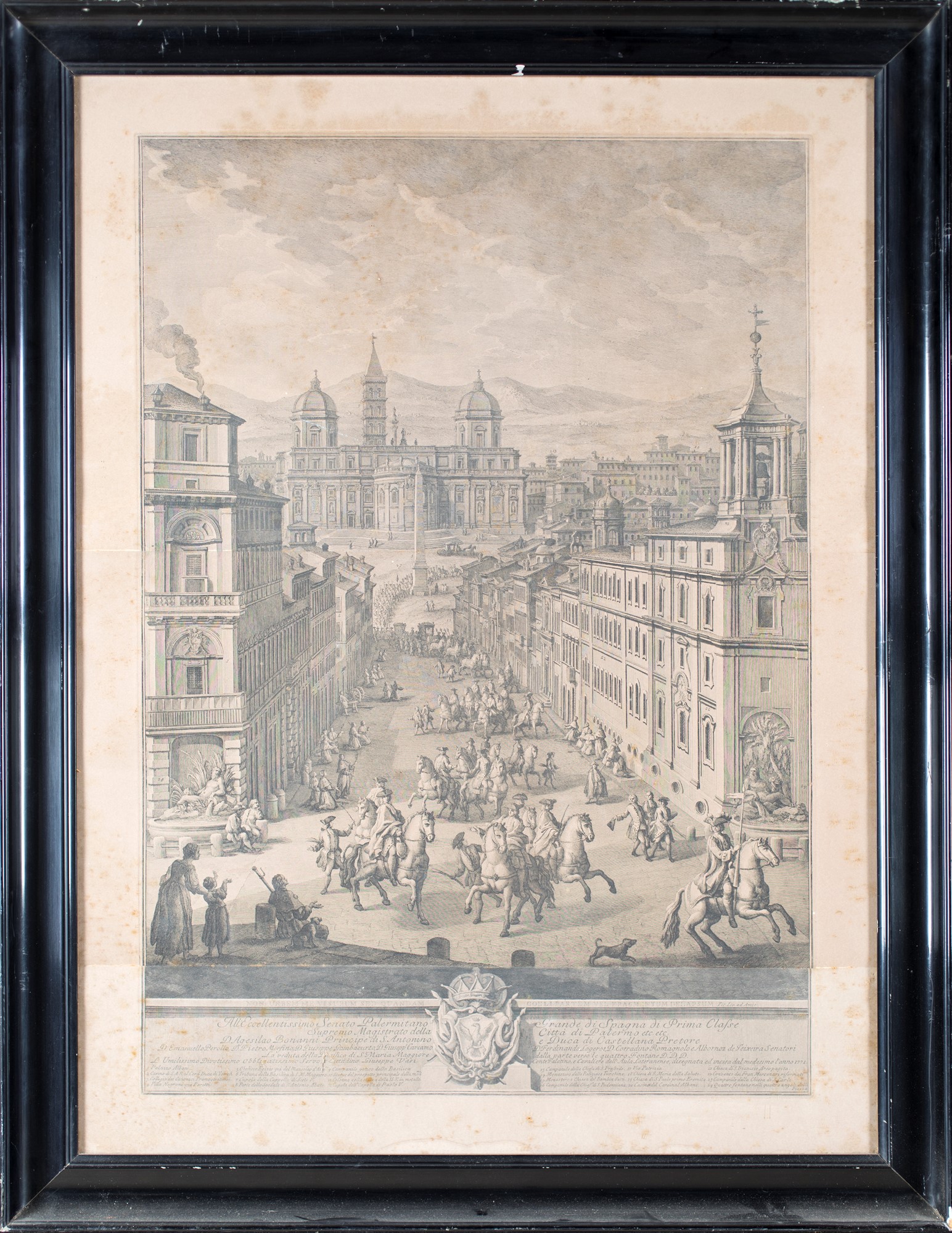 Giuseppe Vasi - Tre incisioni all'acquaforte, seconda metà del XVIII secolo - a) Veduta della Basilica di Santa Maria Maggiore (1771); b) Rovine delle antiche magnificenze di Roma che si veggono nel campo vaccino (1765); c) Veduta della Basilica di S. Paolo fuori delle Mura dal Monte Aventino e dal Fiume Tevere (1771) - cm 100x70 la lastra - con la cornice cm 128x97