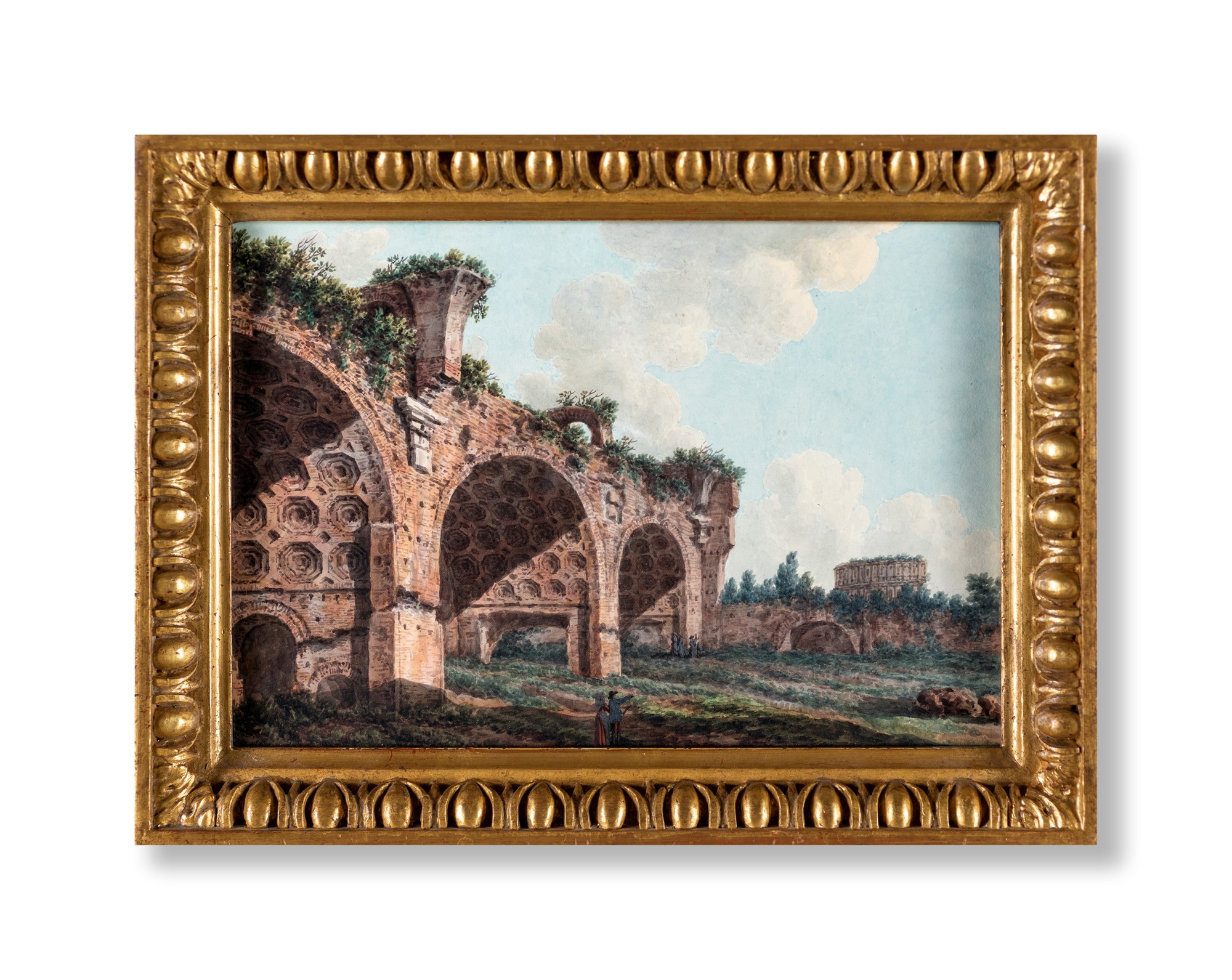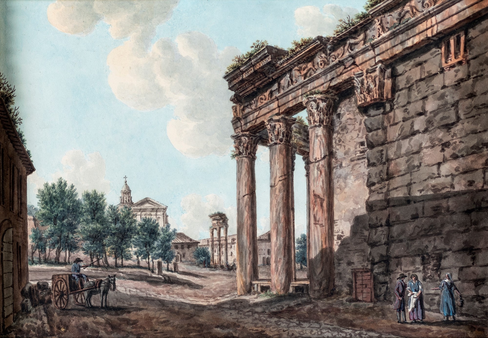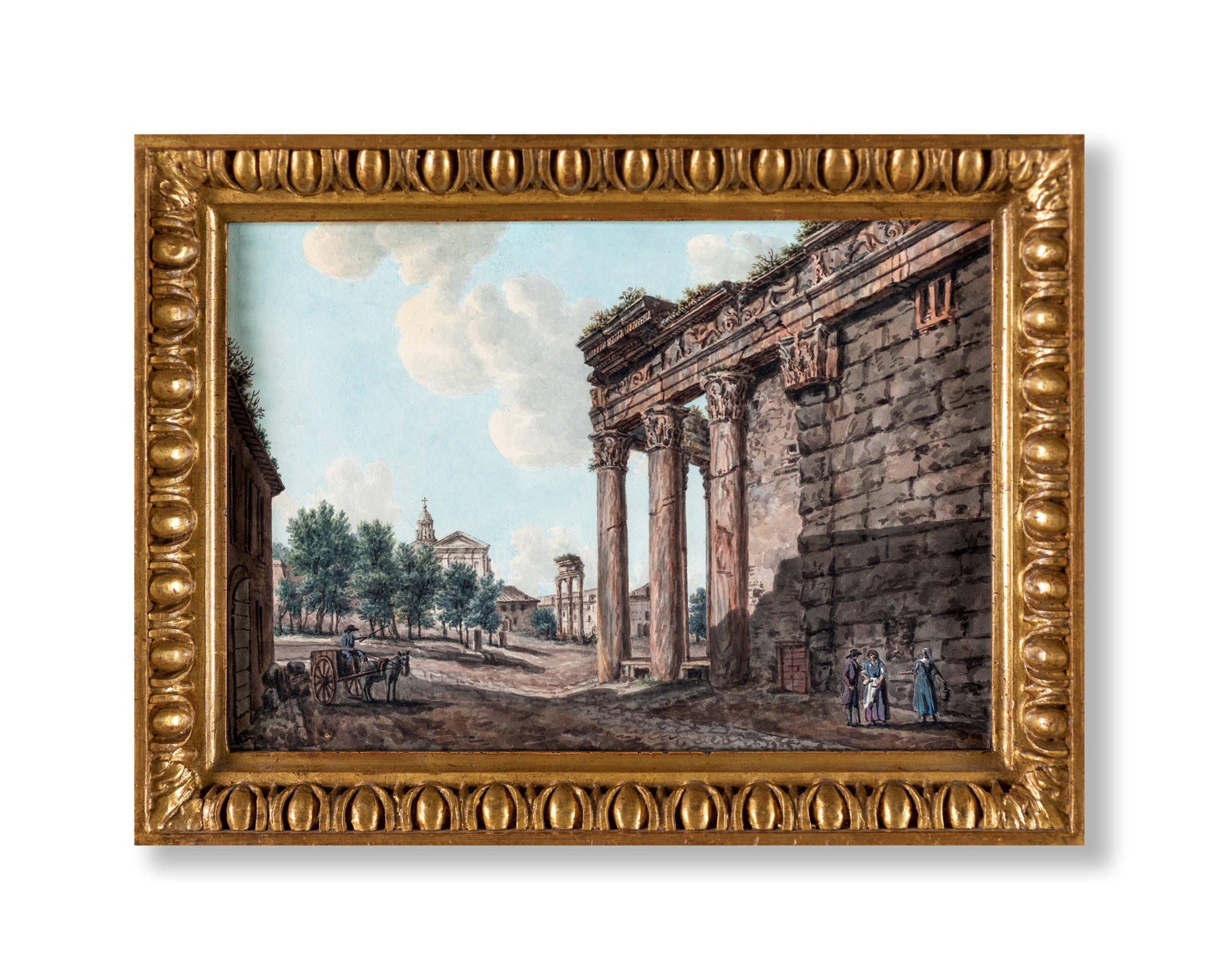 Simone Pomardi (attribuito) - a) Scorcio del Foro con i resti del tempio di Antonino e Faustina b) Resti della Basilica di Massenzio al Palatino e l'Anfiteatro Flavio in lontananza - coppia di acquerelli e tempera su carta - cm 19x27