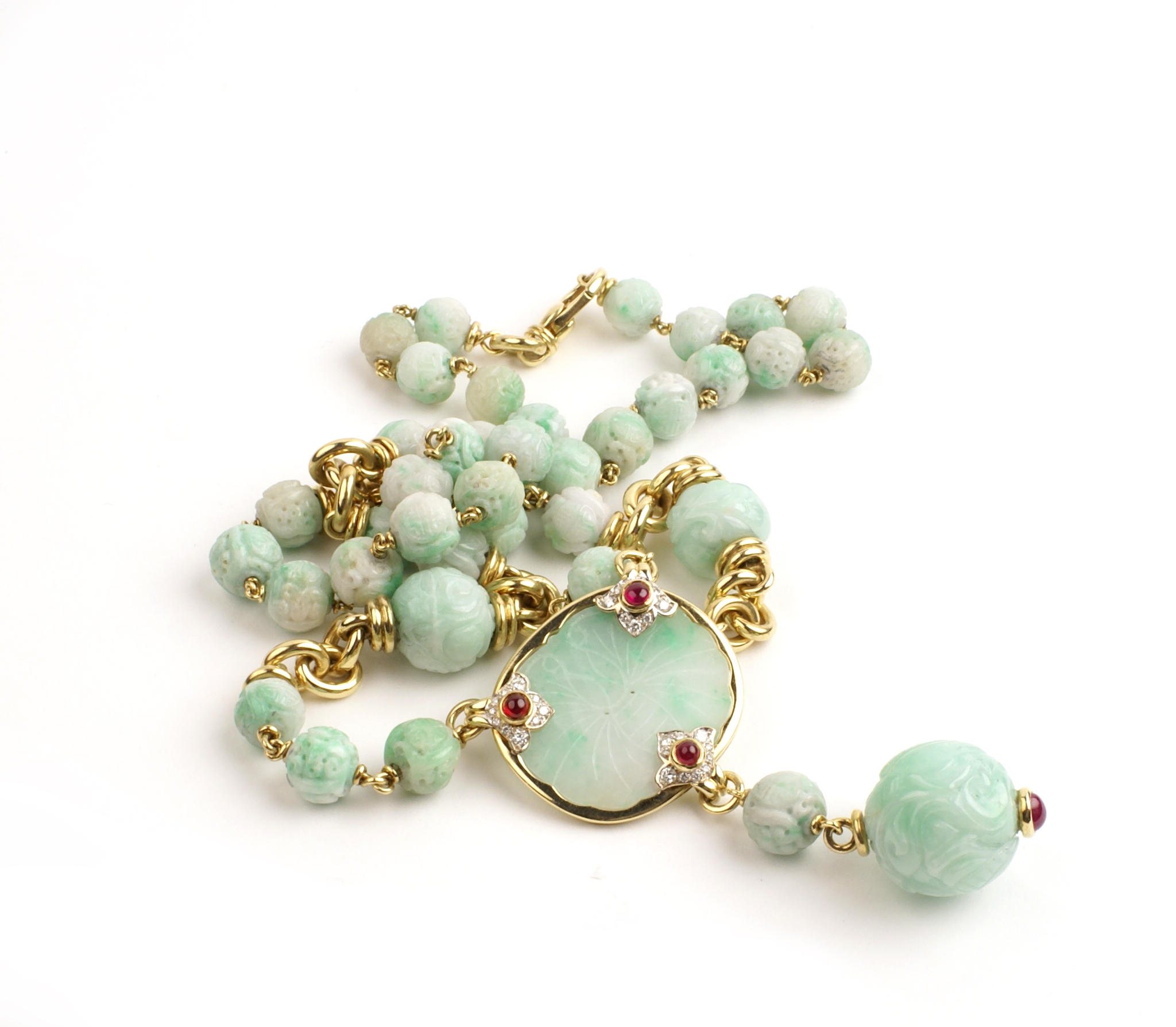 PARTICOLARE COLLANA DI GIADA NATURALE INCISA provenienza Birmania montata in oro giallo 18kt, pendente centrale con diamanti taglio brillante per 0,90 punti circa e rubini taglio cabochon 183,50 gr.