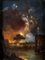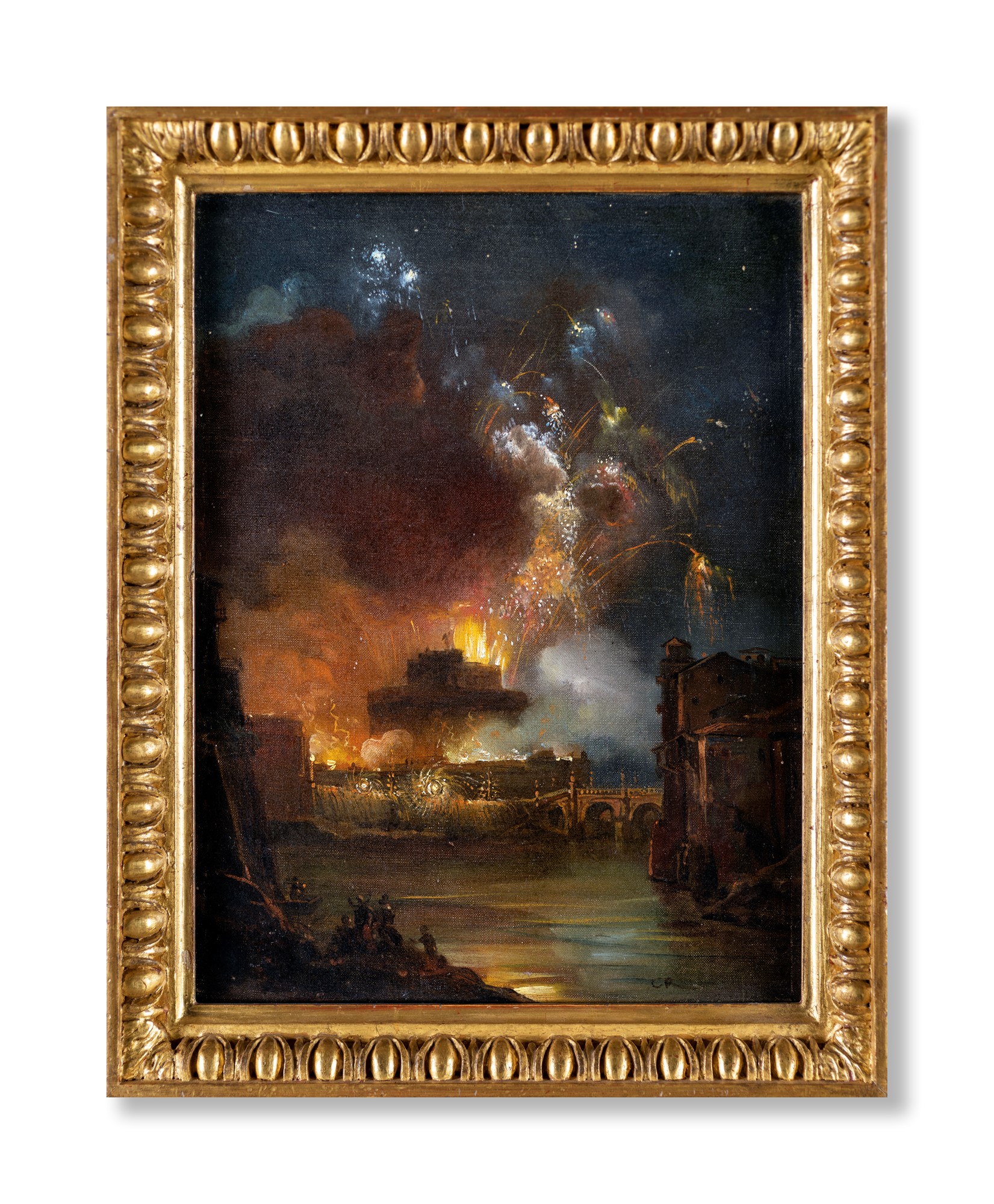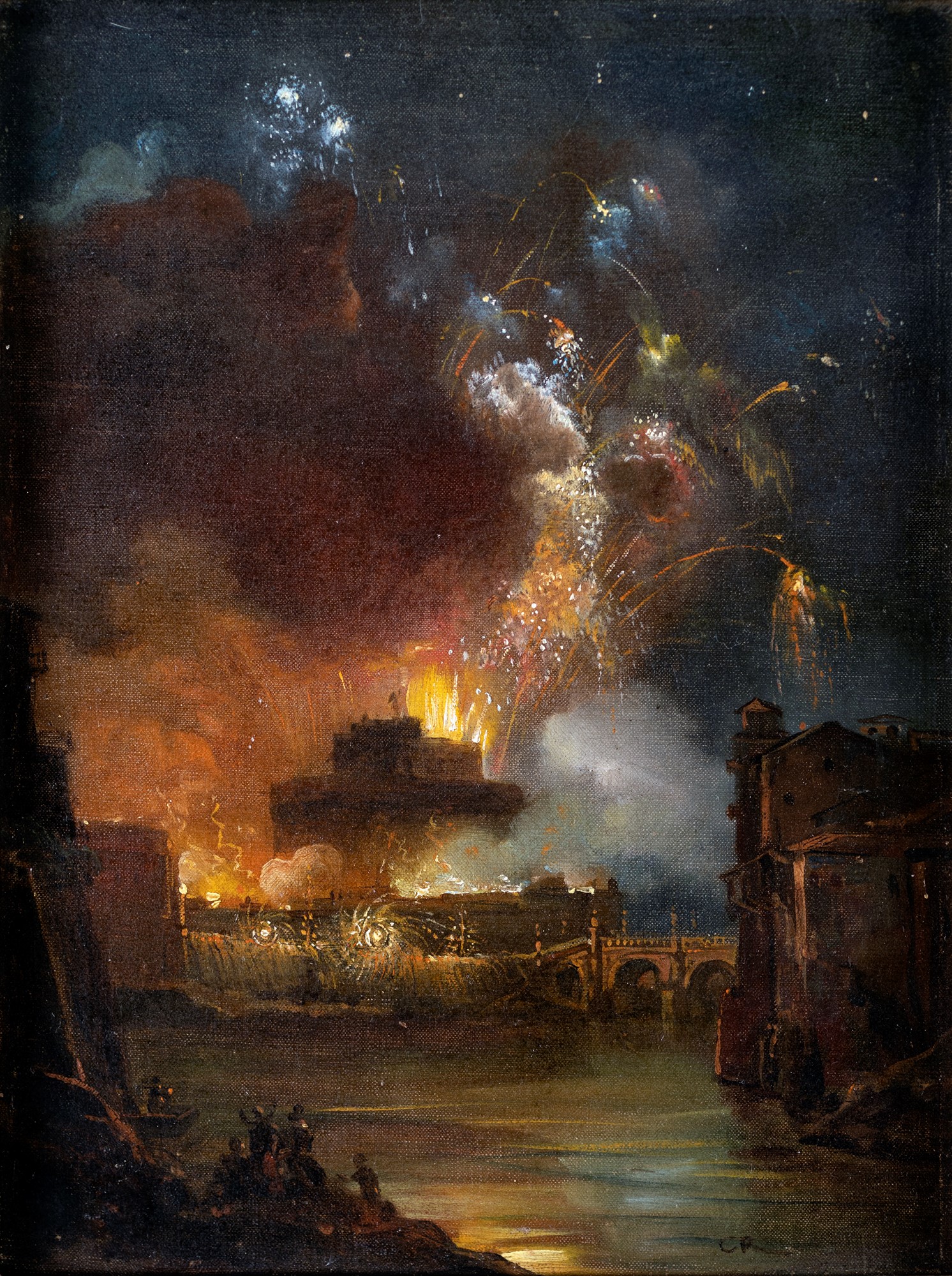 Scuola romana XIX secolo - La girandola di Castel Sant'Angelo - Siglato in basso a destra: C.P. Lo spettacolo pirotecnico ha origine intorno al Seicento, ideato da Michelangelo Buonarroti per i festeggiamenti dei santi Pietro e Paolo fondatori della Chiesa e patroni di Roma. Venne interrotto nel 1886 dalle autorità italiane che lo ritennero troppo pericoloso. - olio su tela - cm 31x24