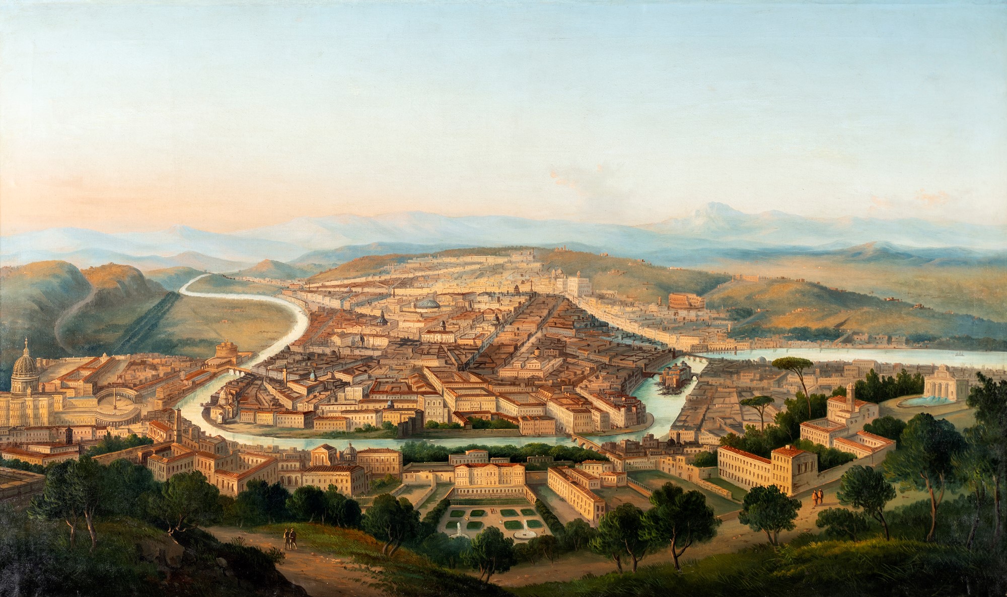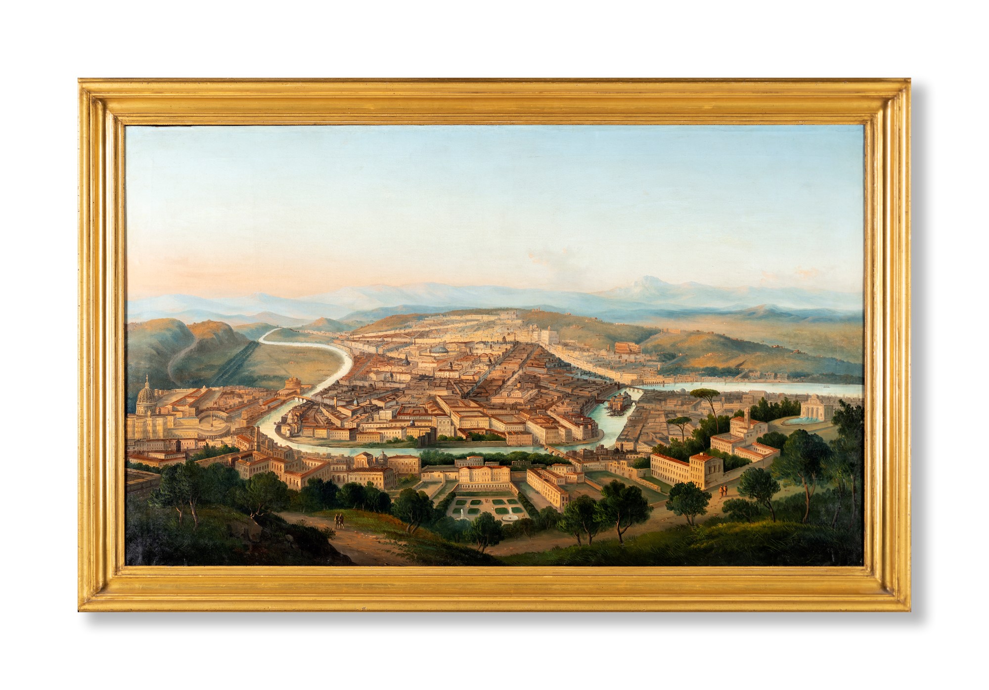 Pittore del XIX secolo - Veduta aerea di Roma dalla balconata sul monte Gianicolo - olio su tela - cm 78x128