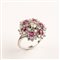 ANELLO A MOTIVO FLOREALE IN ORO BIANCO 18KT con al centro un diamante taglio brillante per 0,40 punti circa circondato da brillanti per 0,70 punti circa e rubini tondi, misura 12 8 gr.
