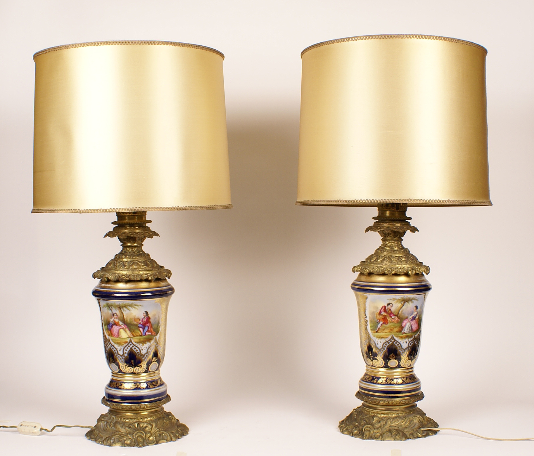 COPPIA DI LAMPADE IN PORCELLANA Francia fine del XIX Sec. dipinte in policromia su fondo blu cobalto e parzialmente dorate, decorate a motivi floreali e di scene galanti entro riserve, montature in bronzo dorato e cesellato, complete di paralumi h. 75 cm.