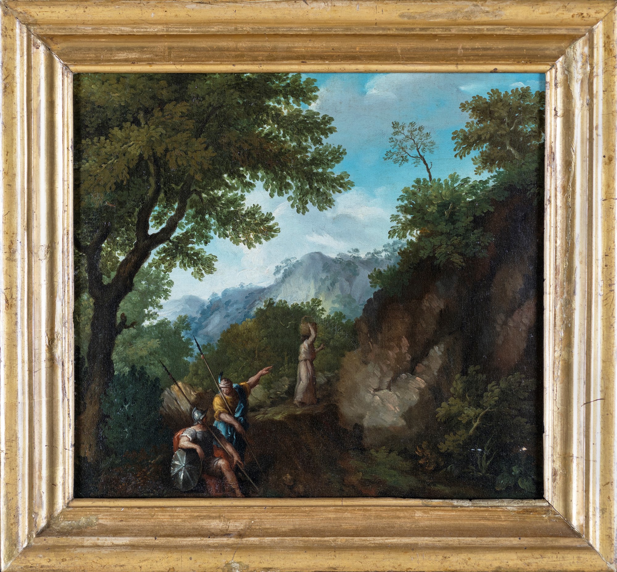 Scuola Romana del XVIII secolo - Paesaggio boschivo con figure di soldato e donna con orcio - olio su tela - cm 42x46