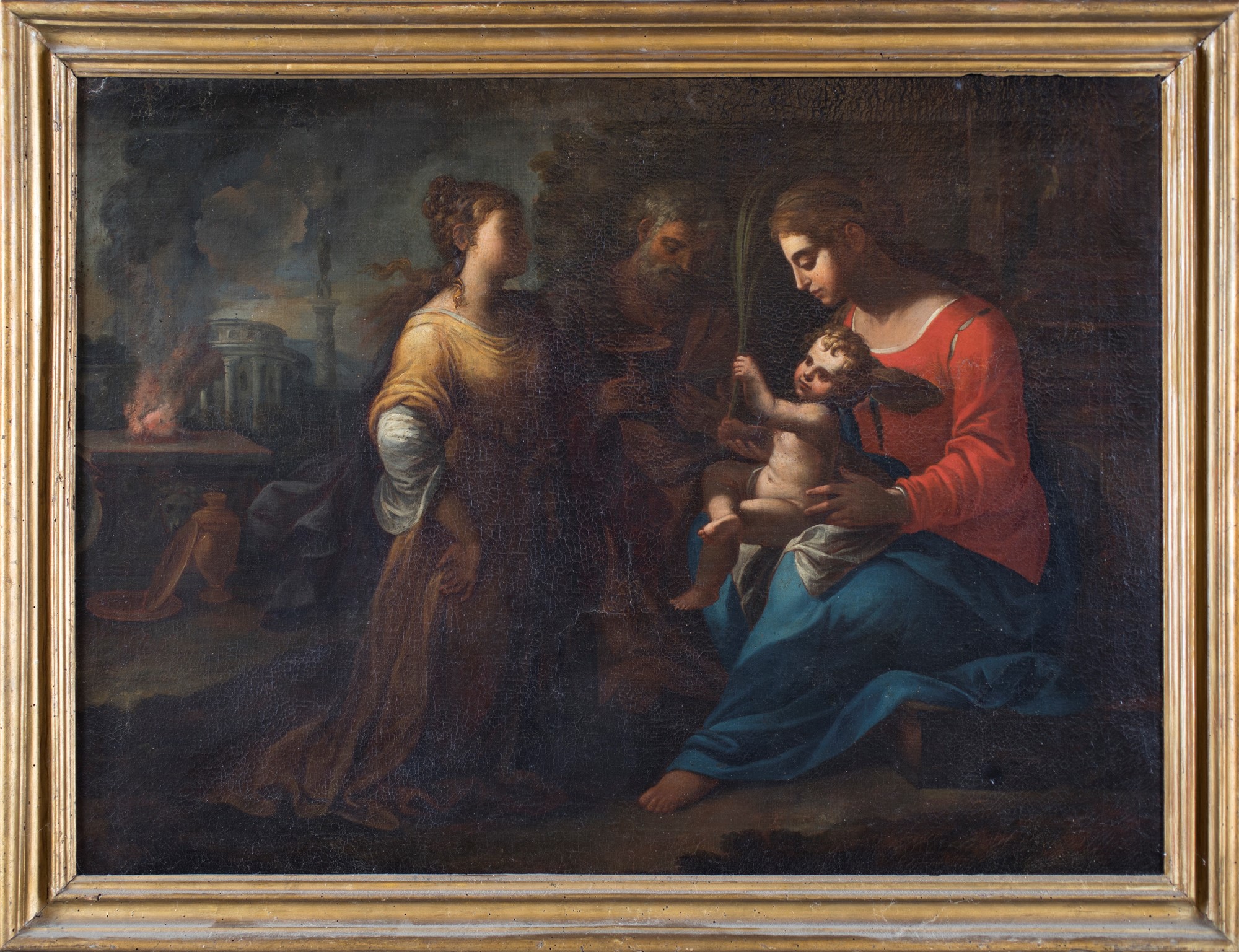 Scuola romana del XVII secolo - Matrimonio mistico di Santa Caterina - Sacra Famiglia con Santa Caterina d'Alessandria e il tempio di Vesta in fiamme in lontananza quale simbolo dell'eternità di Roma - olio su tela - cm 74×99
