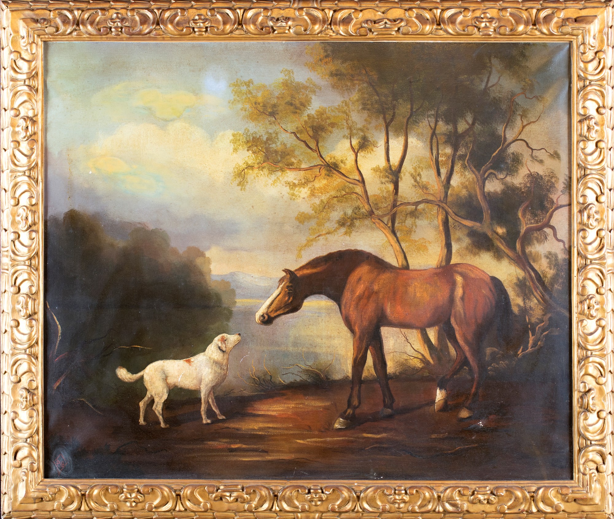 Pittore del XIX secolo - Paesaggio con cavallo e cane - Siglato in basso a...