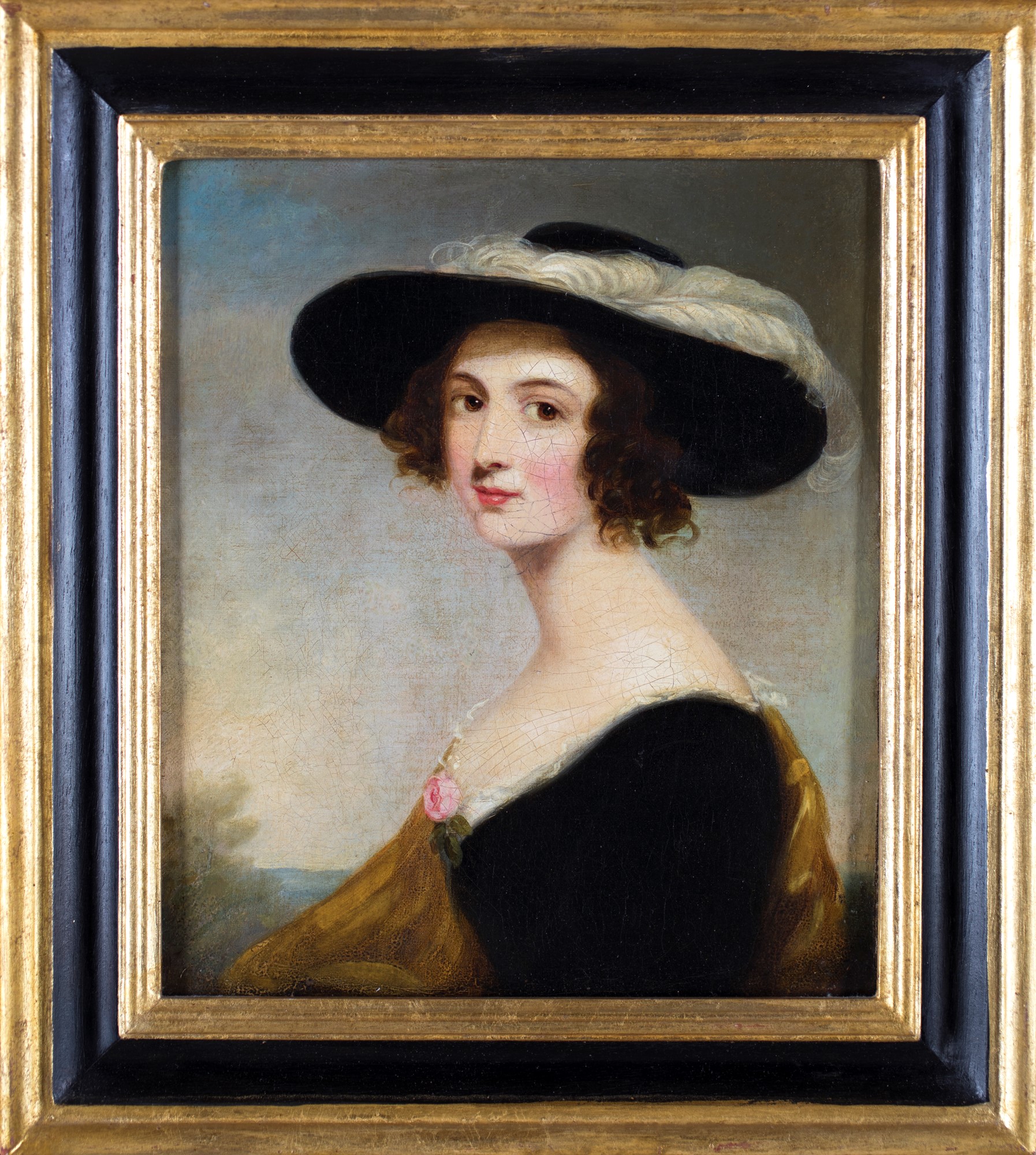 Pittore del XIX secolo - Ritratto di fanciulla con cappello piumato - olio su...