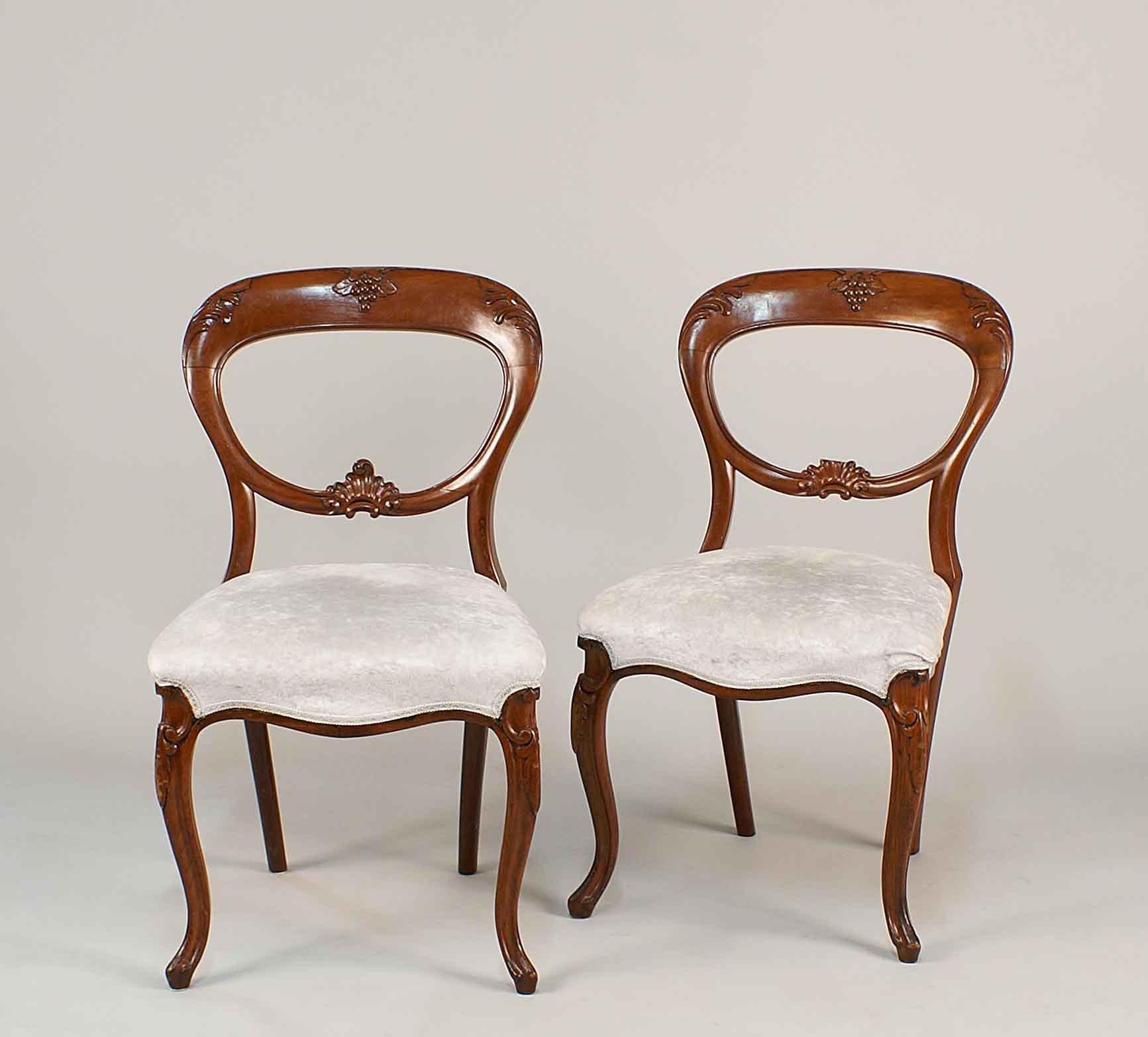 COPPIA DI SEDIE IN MOGANO vecchia manifattura schienale traforato e decorato a motivi di grappoli d'uva e volute, sedute in tessuto H. 80 cm.