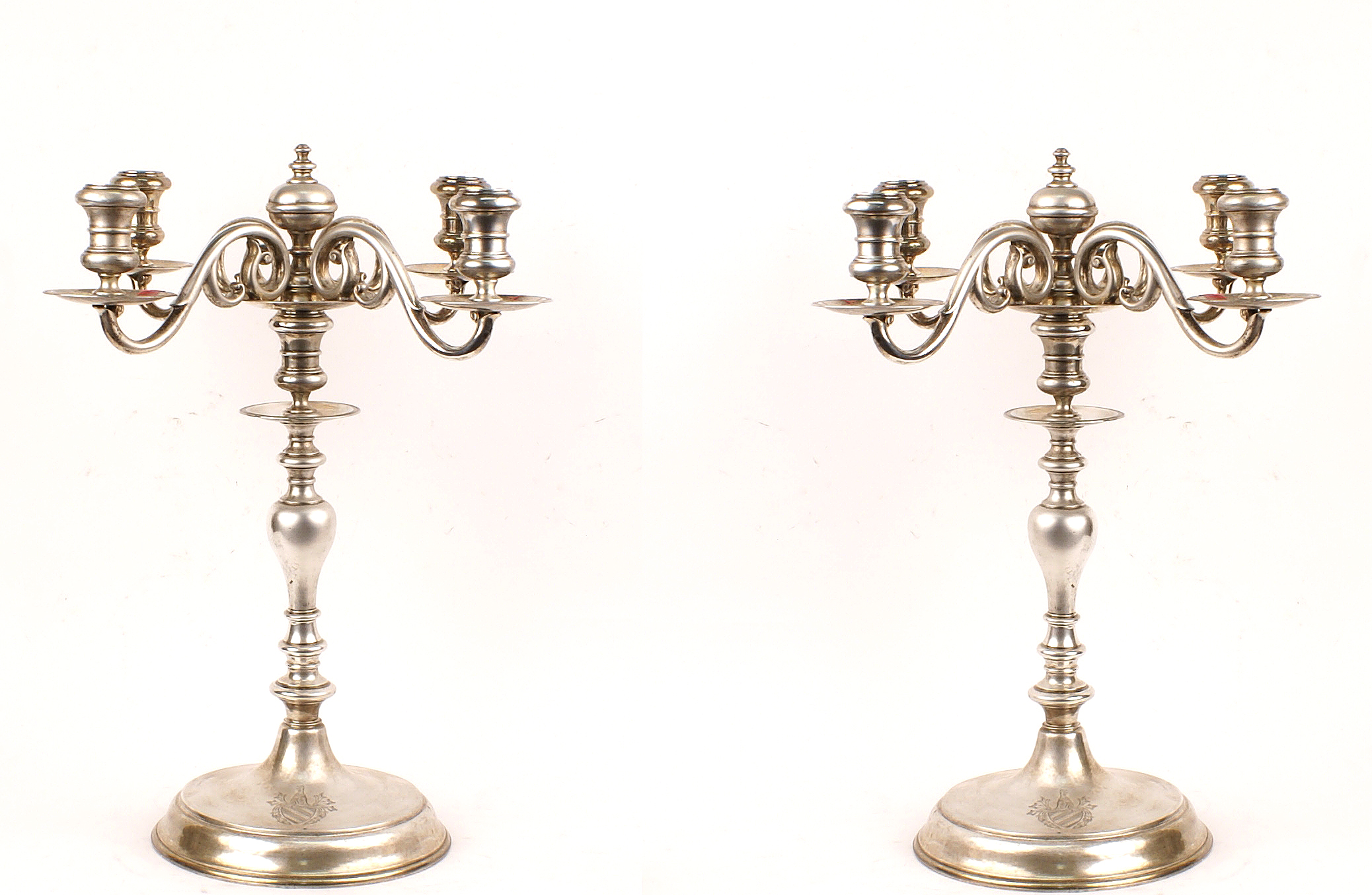 COPPIA DI CANDELABRI IN ARGENTO A QUATTRO FIAMME Londra 1853, orafo Robert Garrard braccia sagomate poggianti su stelo a balaustro, base circolare centrata da uno stemma nobiliare, cm. 50x40 5200 gr.