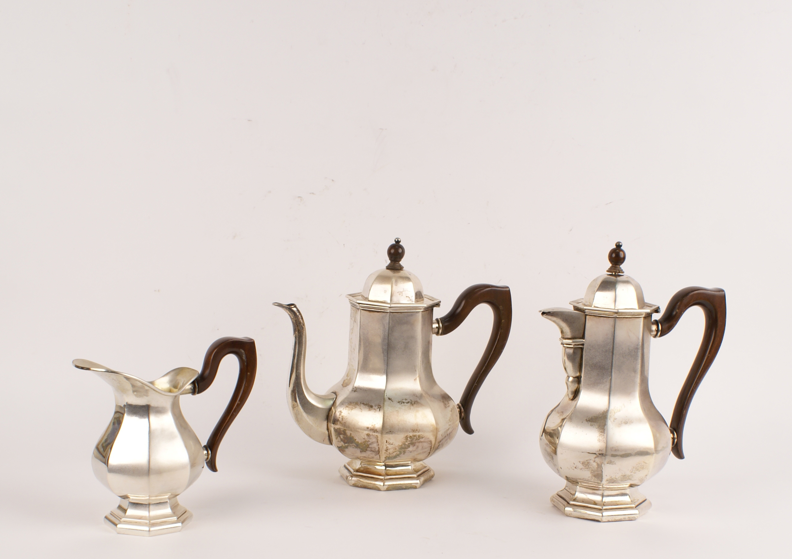 SERVIZIO THÈ E CAFFÈ IN ARGENTO manifattura italiana a corpo liscio con manici in legno, composto da una teiera, una caffettiera e una lattiera 1600 gr.