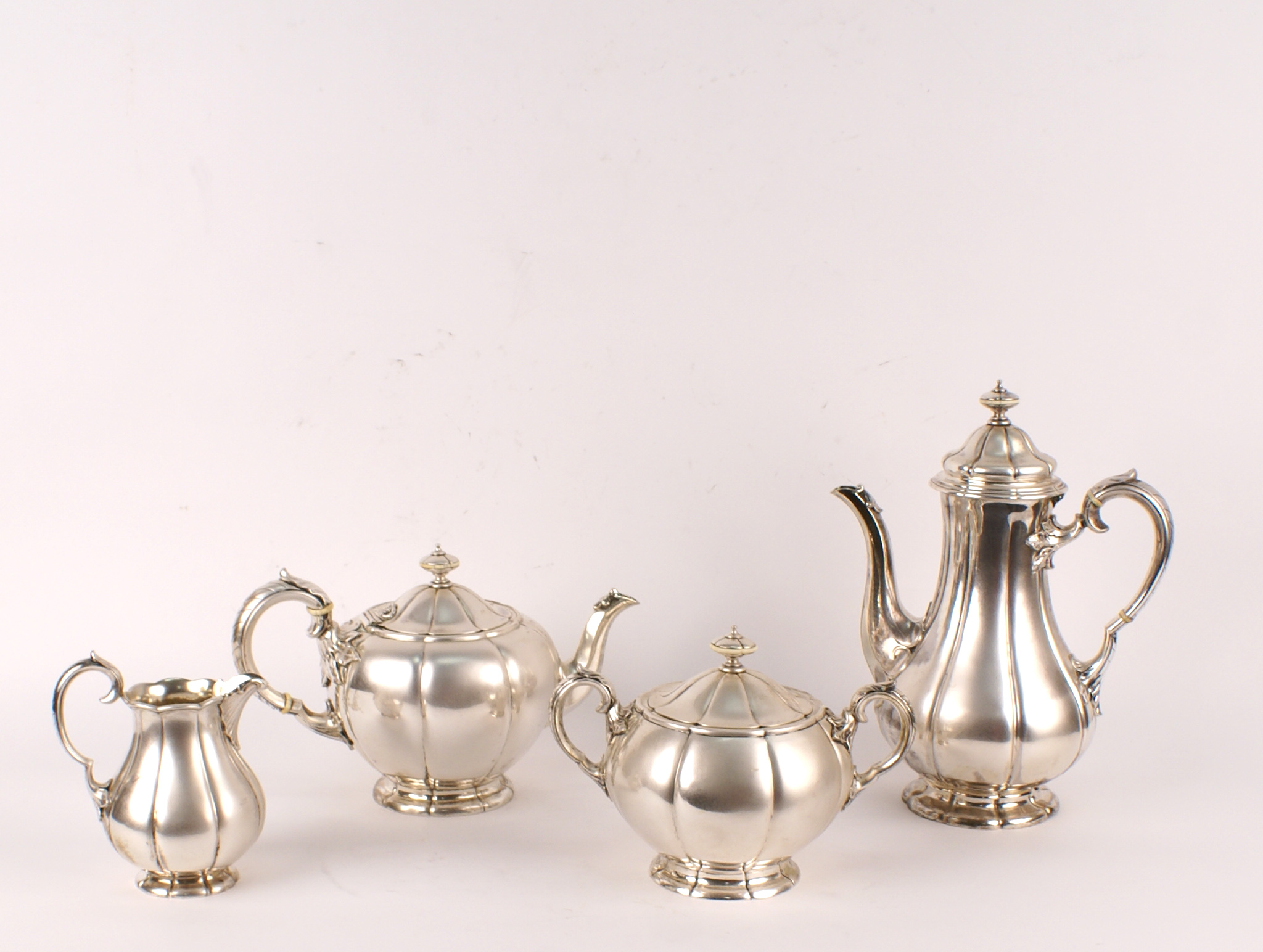 SERVIZIO THE E CAFFE IN ARGENTO Mosca, San Pietroburgo 1864 corpo baccellato con manici decorati a motivi floreali, composto da una teira, una caffettiera, una zuccheriera e una lattiera 3100 gr.
